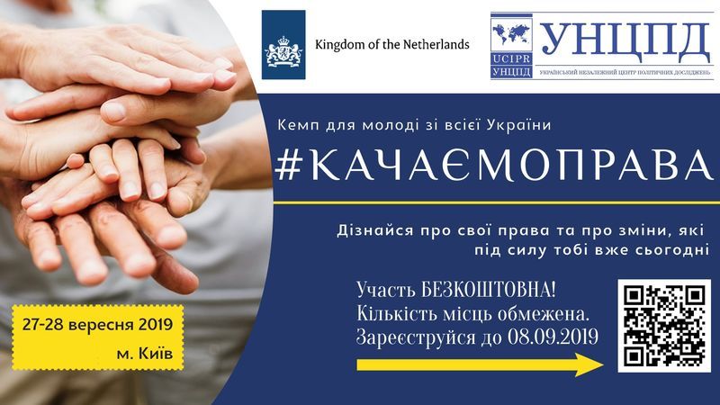 27 та 28 вересня 2019 року у Києві відбудеться кемп для молоді зі всіх куточків України “Качаємо права”. Табір “Качаємо права”, мета якого — розмова з молоддю про різноманіття та рівність, проводить Український незалежний центр політичних досліджень (УНЦПД) за підтримки програми MATRA Міністерства закордонних справ Королівства Нідерландів у межах проекту «Оцінюючи парламентські вибори в Україні крізь призму прав людини».