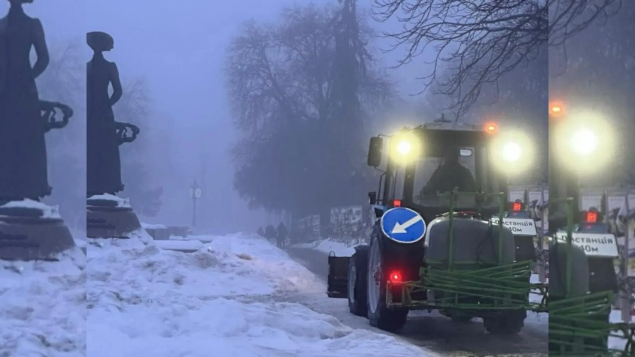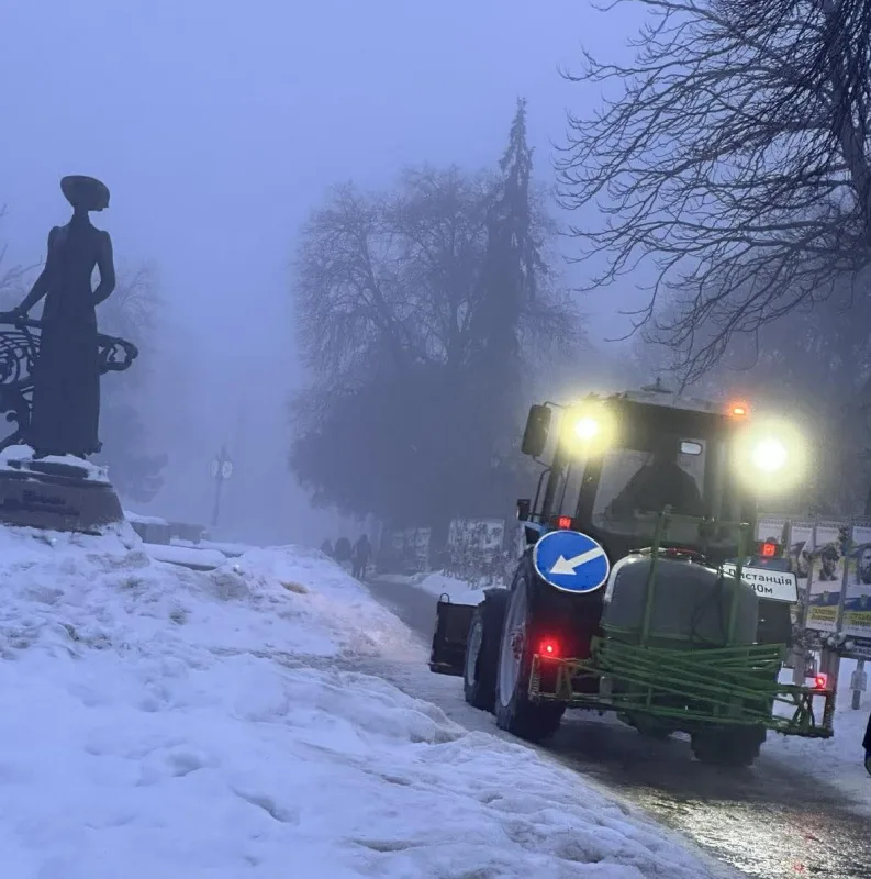3 одиниці техніки здійснювали механізоване підмітання тракторними щітками тротуарів та ще одна машина обробляла тротуари протиожеледними реагентами (ропа).