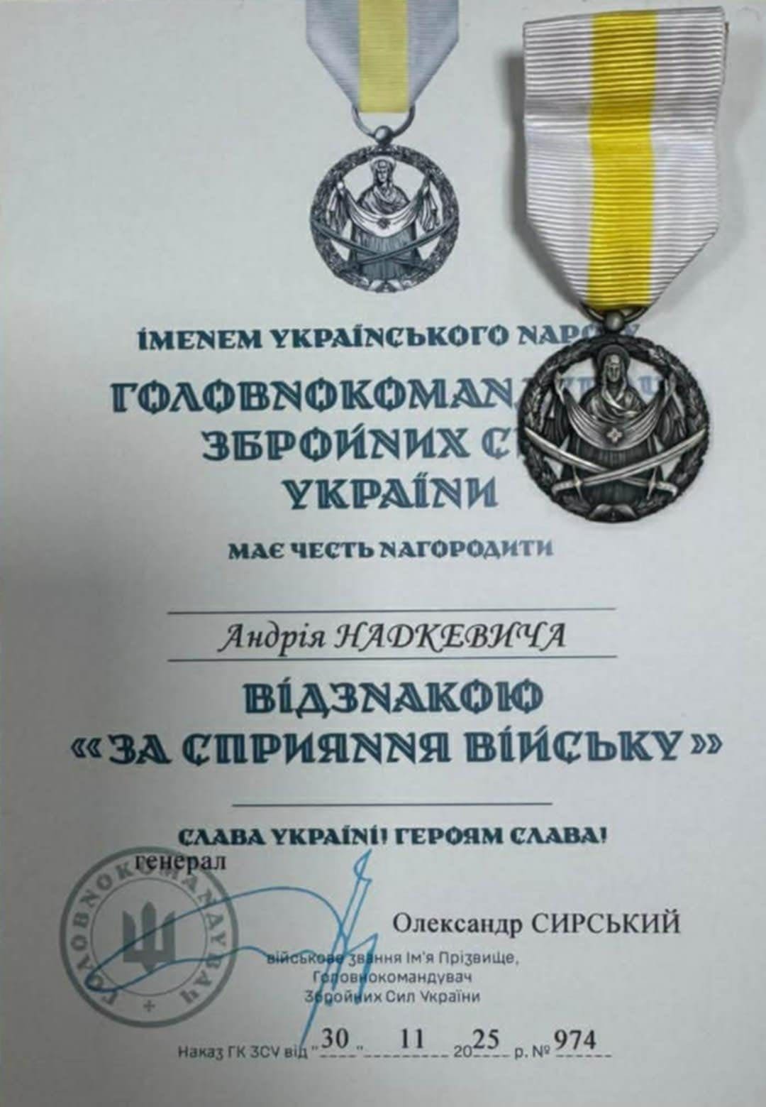 У Міжнародний день волонтера, кандидат медичних наук, лікар-невролог Микулинецької обласної фізіотерапевтичної лікарні реабілітації Андрій Надкевич отримав високу державну нагороду — відзнаку «За сприяння війську» від Головнокомандувача ЗСУ Олександра Сирського.