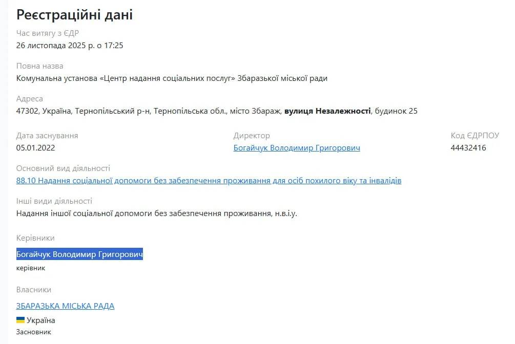 Згідно офіційних реєстрів Збаразький Центр надання соціальних послуг отримав нового керівника – ексзаступника мера Володимира Григоровича Богайчука.