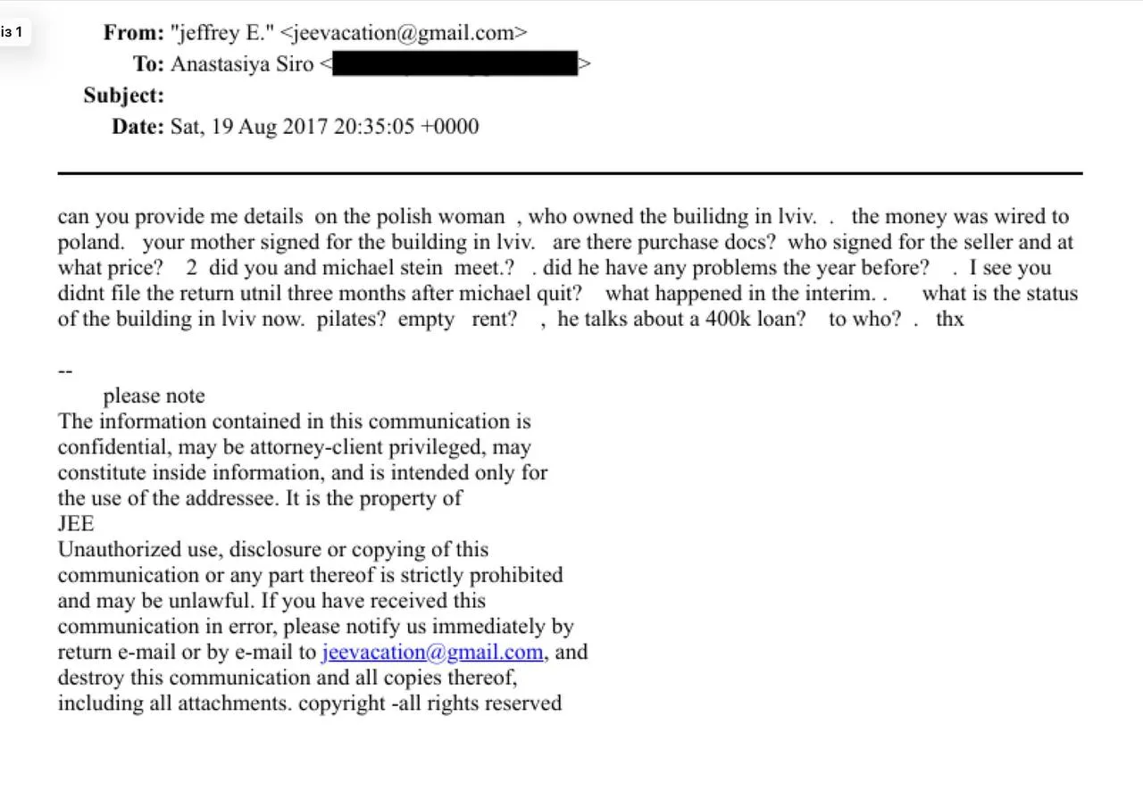 У нових оприлюднених матеріалах з’явилася переписка Джеффрі Епштейна з українкою Анастасією Сіро, з якою він обговорював різні інвестиційні питання.