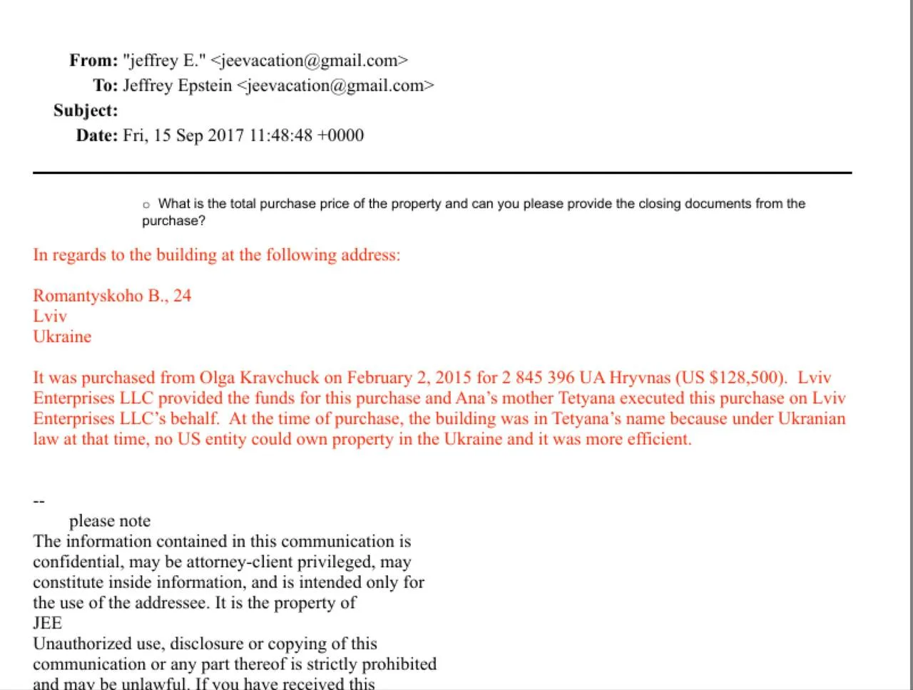 Ймовірно, йдеться про будівлю на вулиці Бориса Романицького, 24. У переписці Епштейн згадує, що мати Анастасії купила її через компанію Lviv Enterprises LLC за суму понад 128 тисяч доларів США.