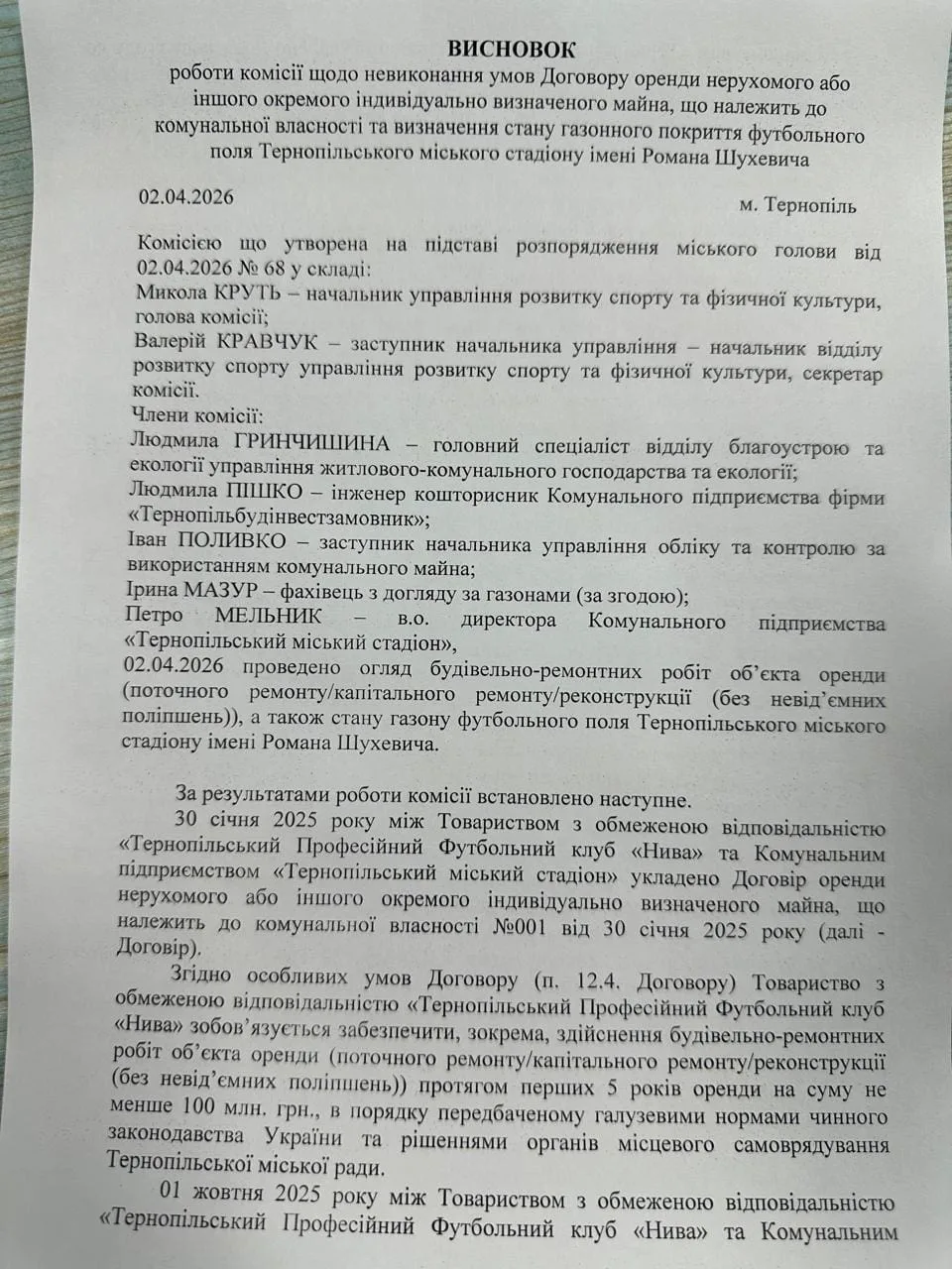 Станом на 2 квітня 2026 року комісія, створена розпорядженням міського голови №68, провела огляд об’єкта оренди. Результати: