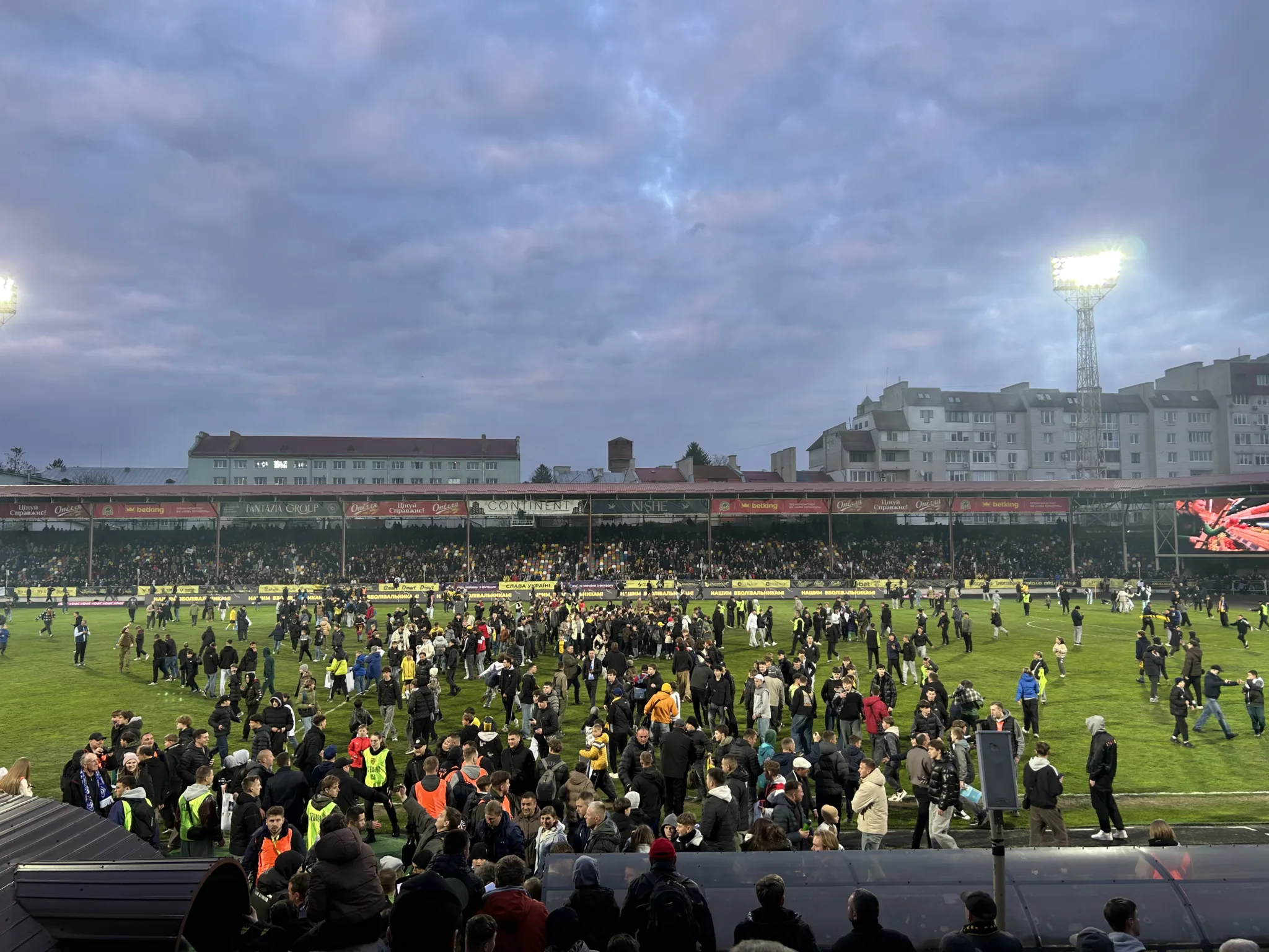 Фінальний свисток – і емоції виходять за межі трибун. Глядачі масово вибігли на поле, оточивши футболістів подекуди так, що вони не могли кроку пройти. Без сумніву, це здивувало не лише футболістів, а й гостей міста. Але про при усе, для Тернополя – це було справжнє футбольне свято.