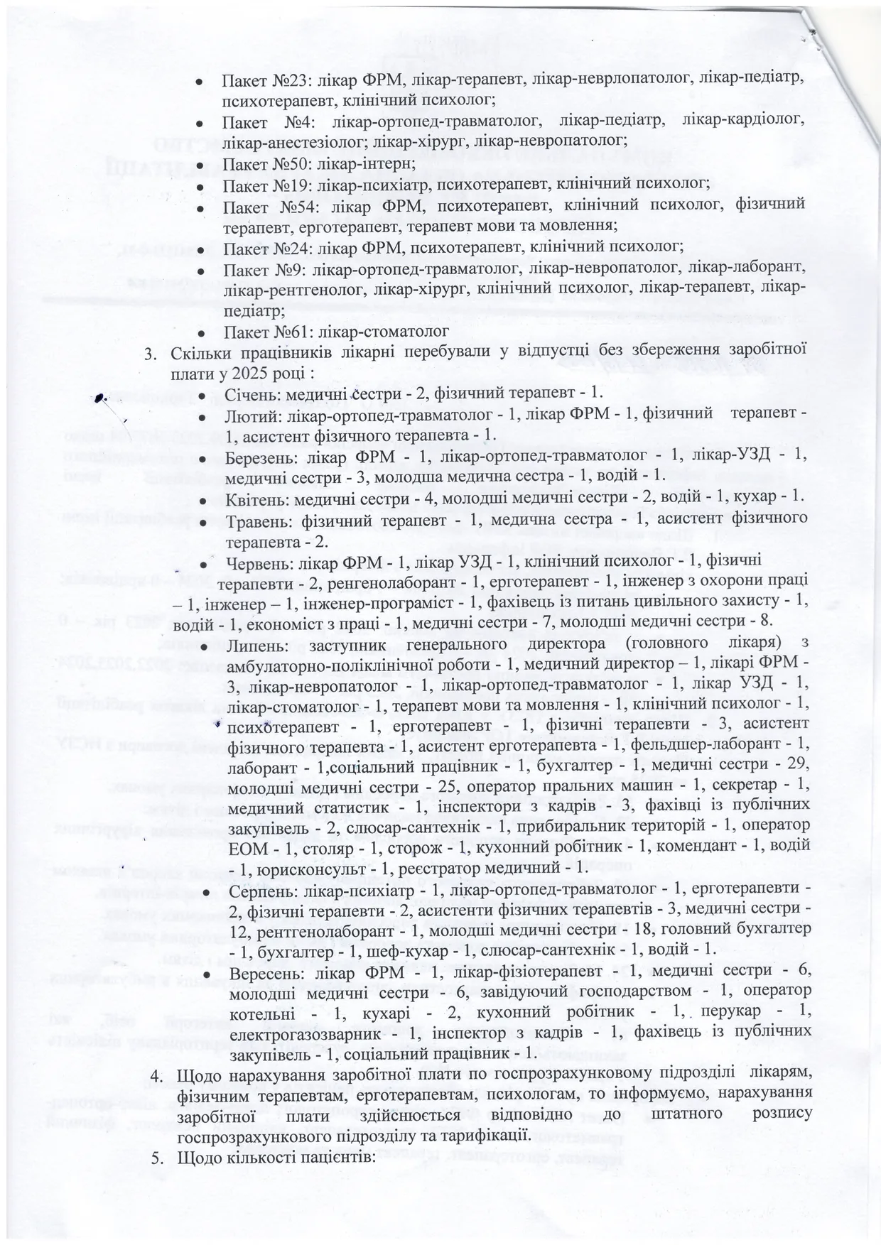 Лікарня має вражаючий перелік укладених договорів з НСЗУ – від реабілітації та паліативної допомоги до стоматології для ветеранів. Вказані також лікарі для кожного пакету. Однак виникає логічне запитання: як в установі, де в окремі місяці понад третина середнього та молодшого медичного персоналу перебуває у неоплачуваних відпустках, вдається підтримувати якість надання таких різноманітних послуг? Чи не страждає від цього найголовніше – здоров’я пацієнтів?