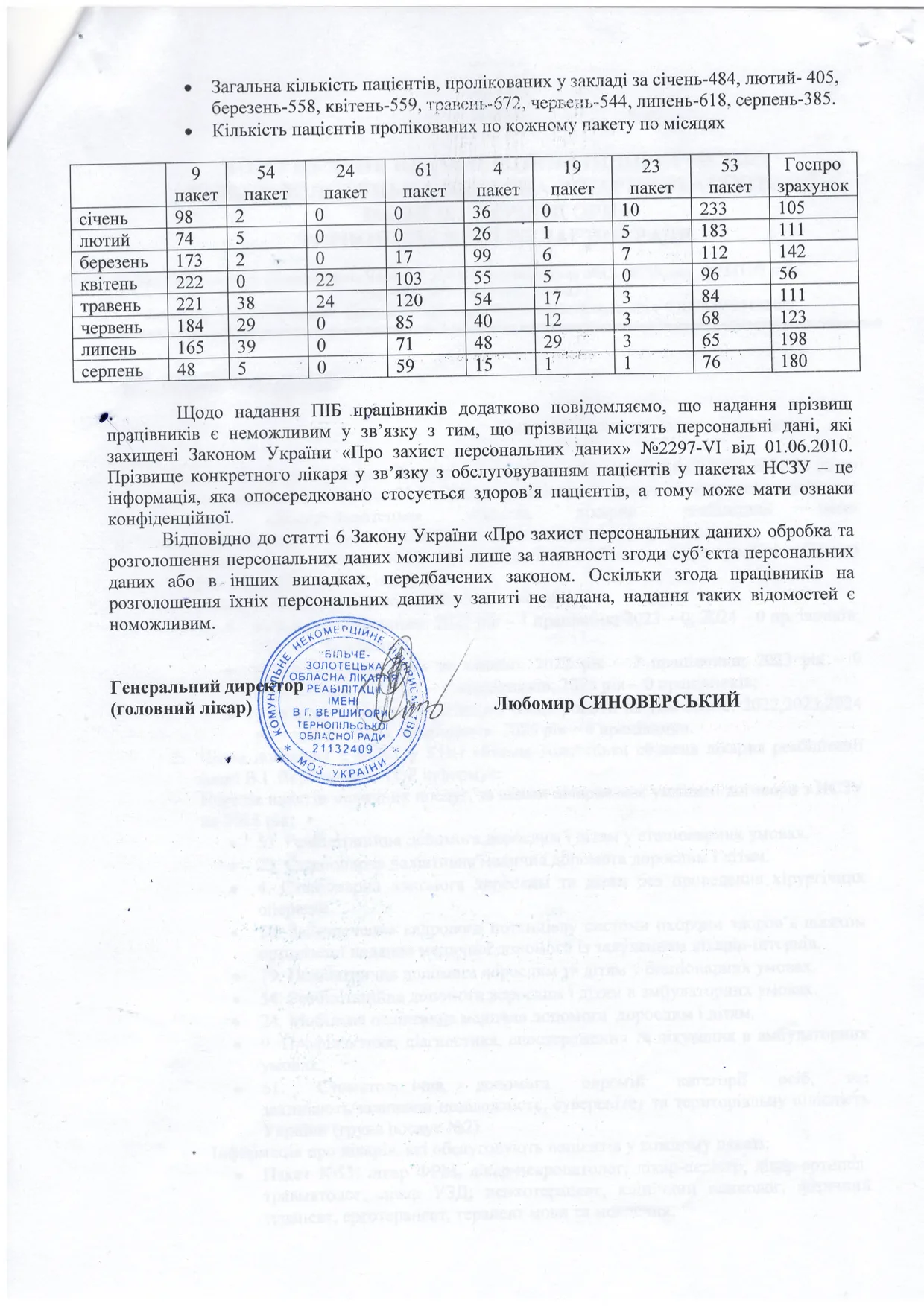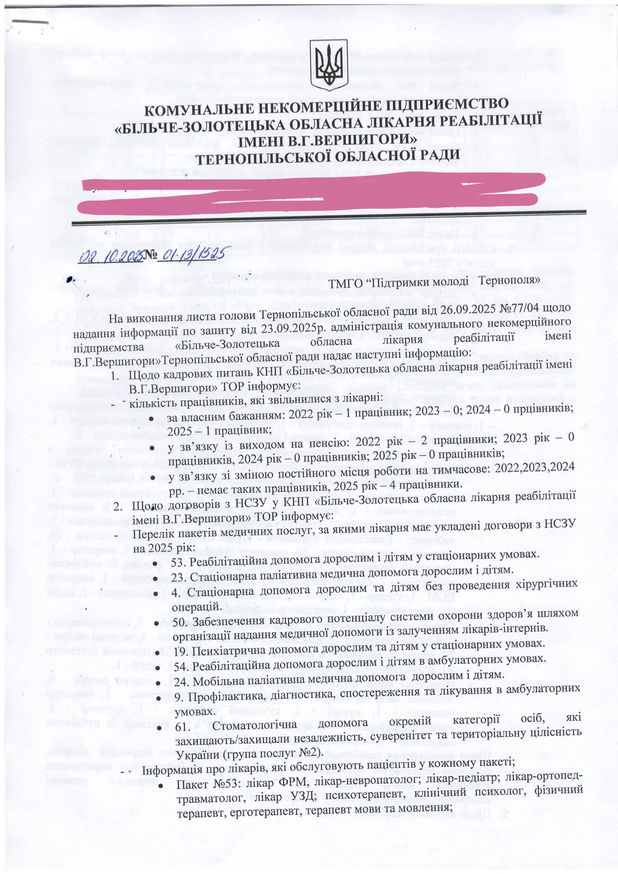 У відповідь на офіційний запит Громадської організації комунальне некомерційне підприємство «Більче-Золотецька обласна лікарня реабілітації імені В.Г. Вершигори» надало звіт про кадрову ситуацію, договори з Національною службою здоров’я та відпустки співробітників. Формально – це звичайний адміністративний документ. Але у ньому є тривожні тенденції, які можуть сигналізувати про серйозні проблеми всередині установи, що відповідає за здоров’я тисяч людей.