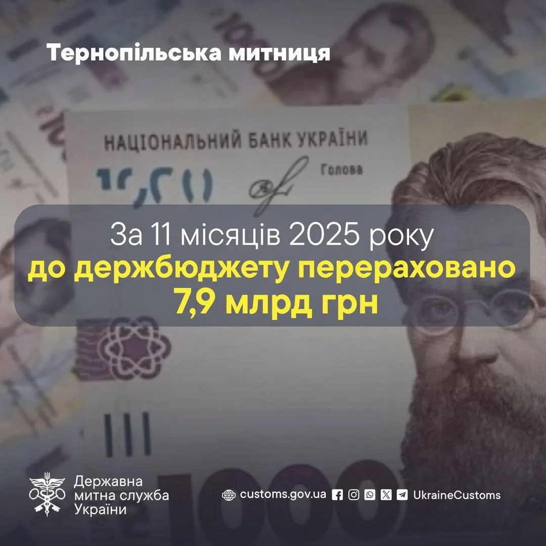 За 11 місяців 2025 року Тернопільська митниця перерахувала до державного бюджету 7,9 млрд грн, що на 733 млн грн більше, ніж за аналогічний період минулого року.