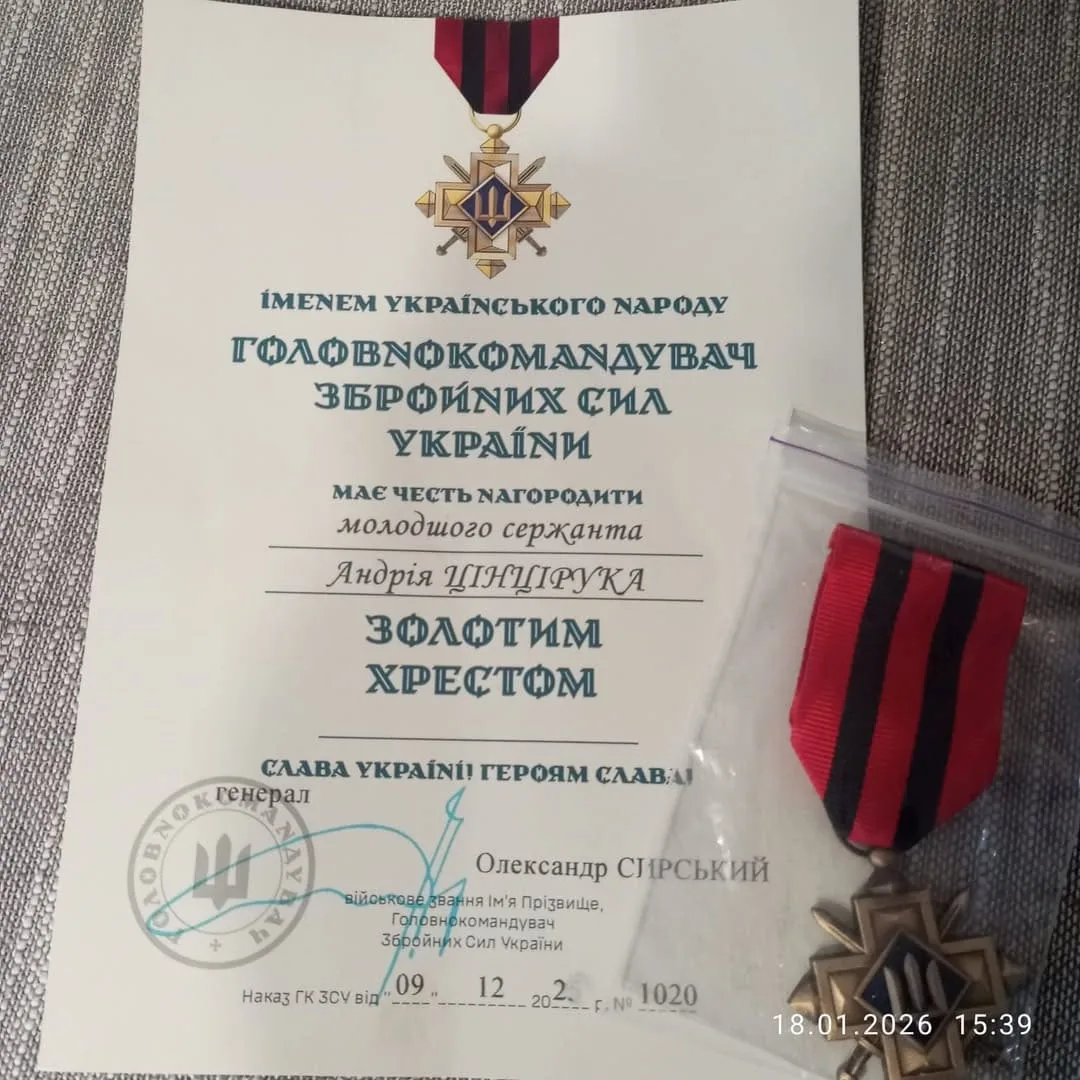 У Лопушенській громаді з гордістю повідомили, що високою нагородою – почесним нагрудним знаком “Золотий хрест” – відзначили їхнього земляка, молодшого сержанта Андрія Цінцірука з села Новий Олексинець.