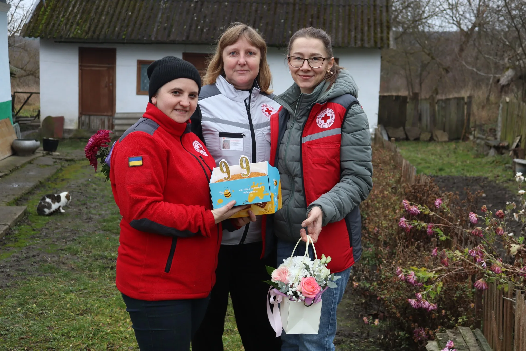 Працівники Червоного Хреста приїхали привітати іменинницю з квітами та тортом, створивши для неї справжнє домашнє свято. Жінка щиро дякувала за увагу й підтримку та не стримувала емоцій, згадуючи пережите.
