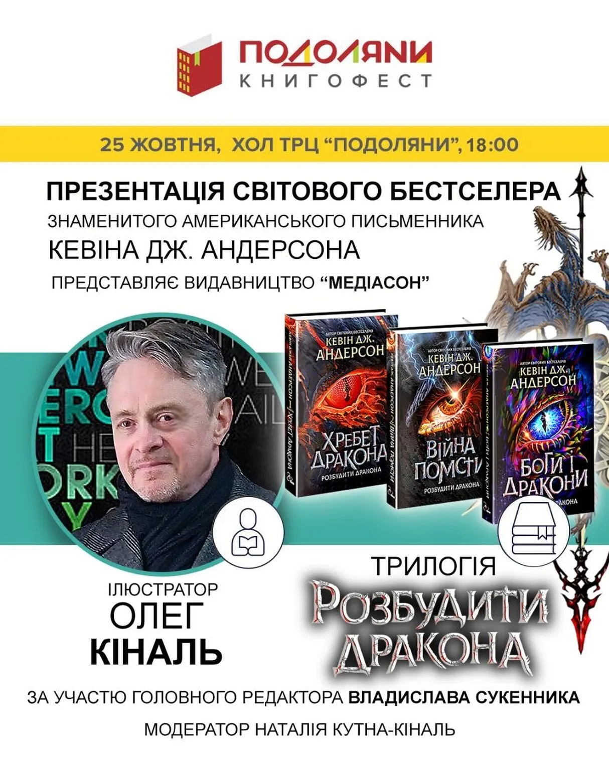 25 жовтня 2025 року в ТРЦ «Подоляни» у Тернополі на Книгофесті «Подоляни» презентували світовий бестселер — трилогію «Розбудити дракона» американського письменника Кевіна Андерсона. Книги, видані українською мовою видавництвом «Медіасон», вперше перекладено з оригіналу і проілюстровано українськими митцями. Трилогія отримала схвальні відгуки на книжковому фестивалі «Письменники та ілюстратори майбутнього» в Голлівуді.