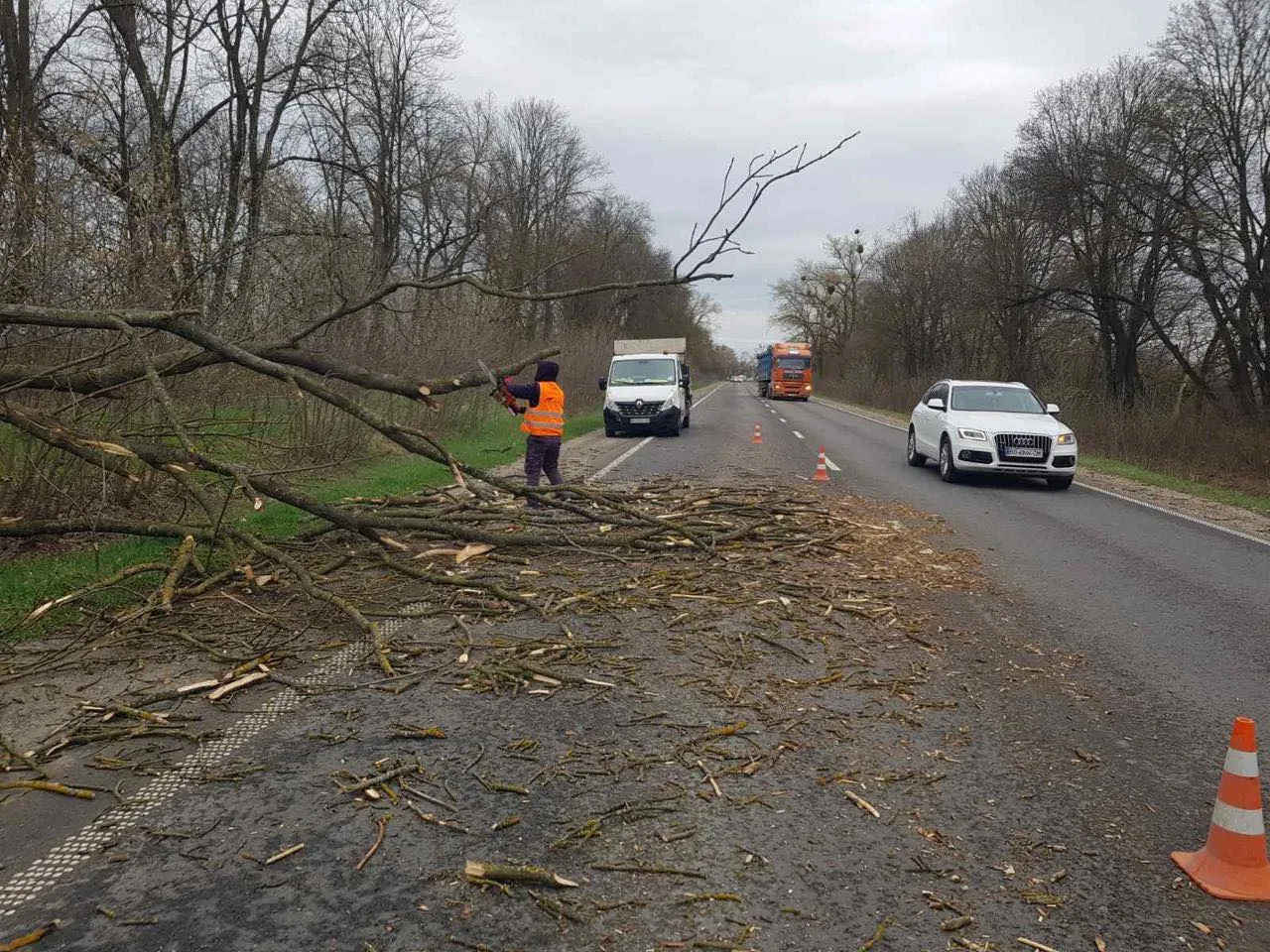 На Тернопільщині через сильні пориви вітру фіксують падіння дерев і гілля на дороги, однак бригади вже працюють на місцях, забезпечуючи безперебійний проїзд автошляхами державного значення.