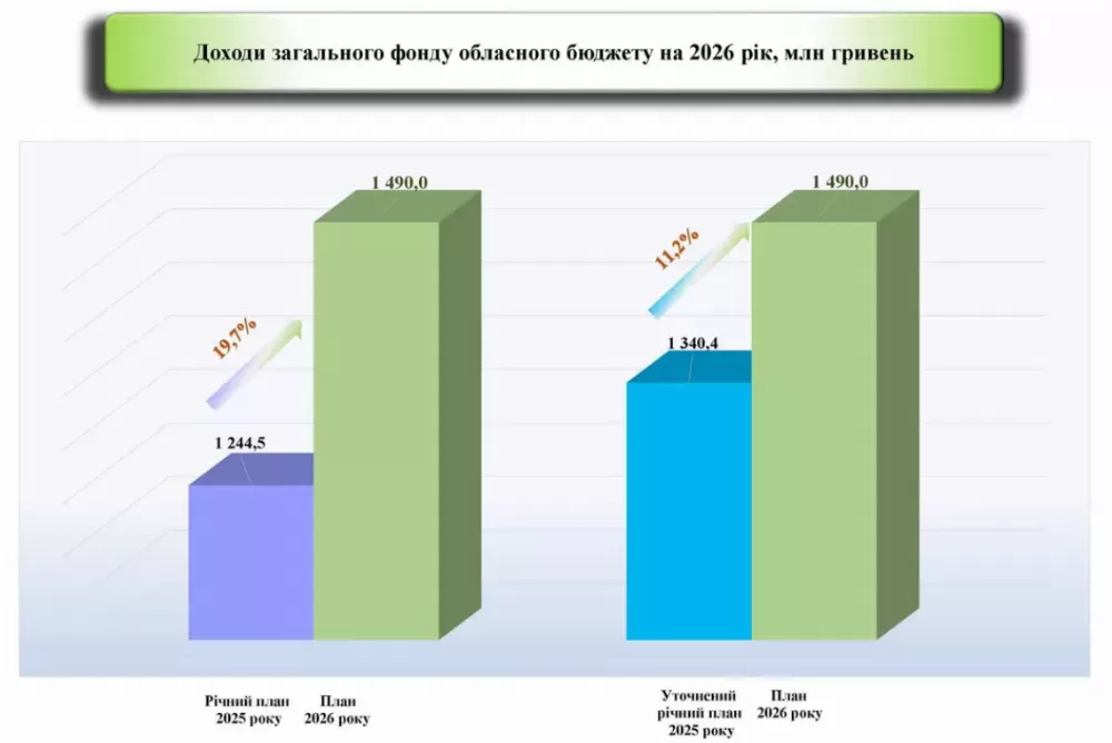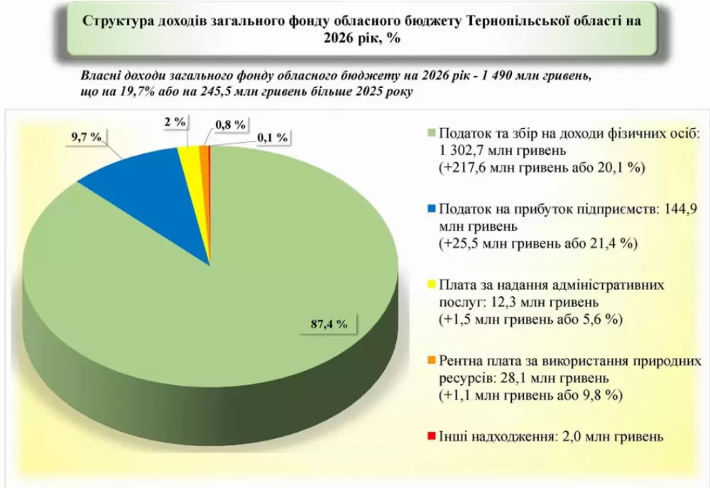 Власні доходи загального фонду становитимуть 1 490 млн грн — це на 245,5 млн грн або 19,7 % більше, ніж у 2025 році. Основним джерелом наповнення бюджету залишається податок на доходи фізичних осіб — 1 302,7 млн грн, що формує 87,4 % надходжень загального фонду.