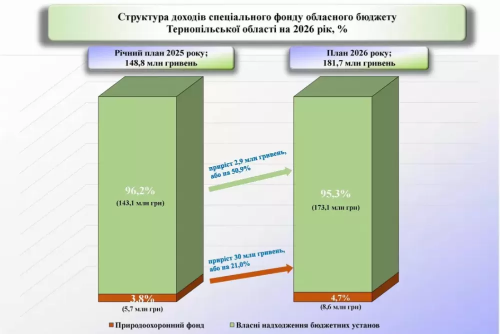 Доходи спеціального фонду заплановано на рівні 181,7 млн грн, що на 32,9 млн грн або 22,1 % перевищує показники 2025 року.