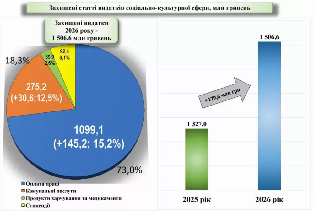 Видатки загального фонду визначено в обсязі 1 753,6 млн грн. Переважна частина коштів — 86 % — спрямовується на захищені статті соціально-культурної сфери. Загалом це 1 506,6 млн грн, що на 179,6 млн грн або 13,5 % більше порівняно з 2025 роком.
