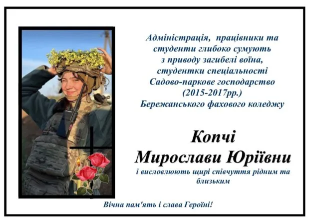 Про це повідомили в добровольчій розвідувальній БПАК групі «Баракуда», де служили полеглі. Також загибель Мирослави підтвердили в Бережанському фаховому коледжі НУБІП України, де вона навчалася з 2015 по 2017 рр. по спеціальності Садово-паркове господарство, пише “Перший Онлайн”.
