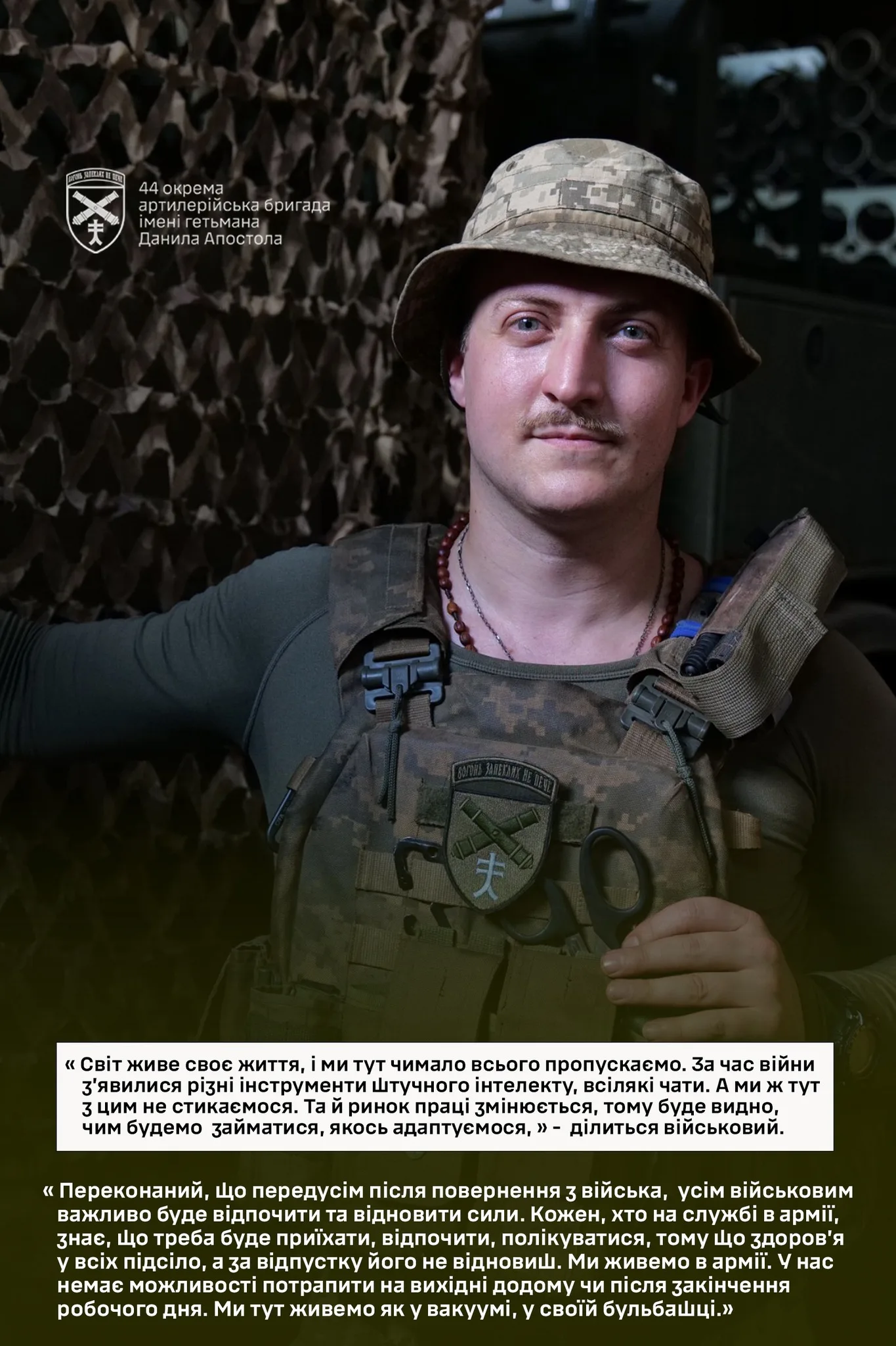 “Все, що я знаю в артилерії, мене навчили інші мобілізовані офіцери. Мені пощастило в цьому житті, тому що я не маючи жодного бойового досвіду й уявлення, як взагалі функціонує армія, потрапив у колектив, який був зібраний з мобілізованих і культура в нас була побудована на людяності. Звісно, є дисципліна порядку, певна субординація, але головне – є людське розуміння і взаємоповага”, – каже старший солдат.