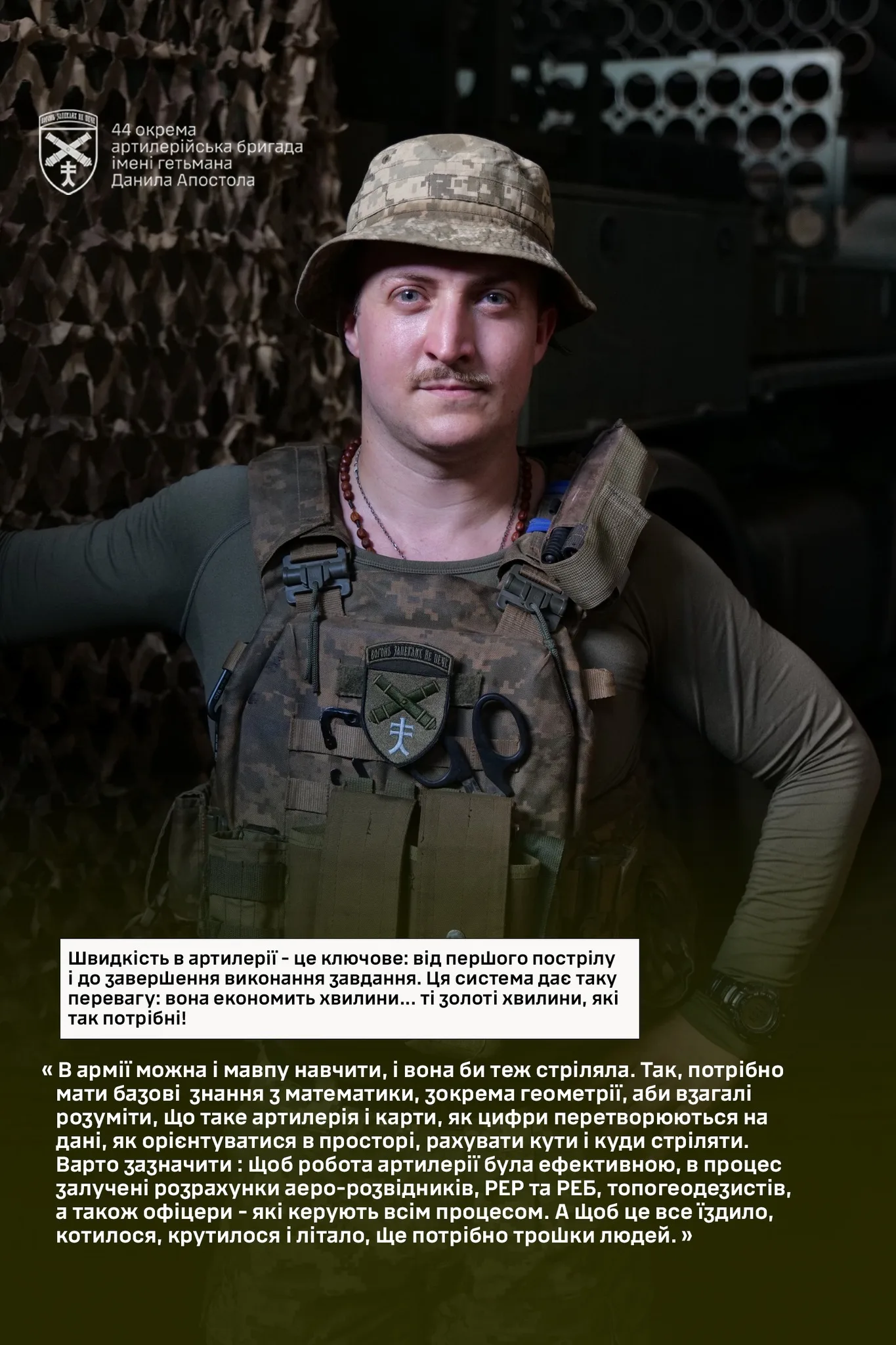 “Від того, як хтось обчислює все для стрільби, рахує і коригує стрільбу, передає дані та розрахунки, залежить наше життя. Так, наше виживання залежить не лише від тих людей, які перебувають безпосередньо на місці біля машини, але й від інших фахівців батареї, які також впливають на час виконання та результати нашої роботи”, – каже військовий.