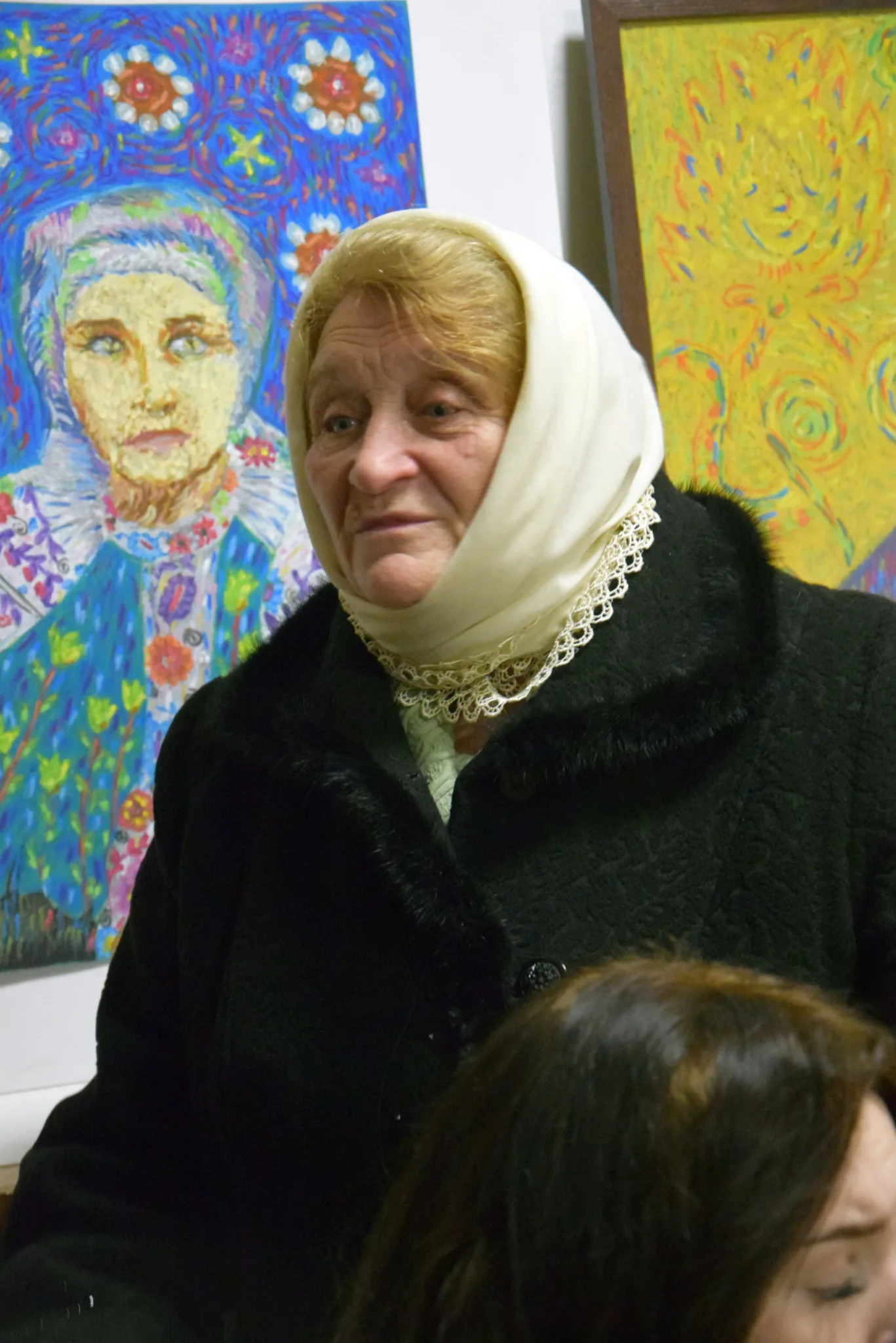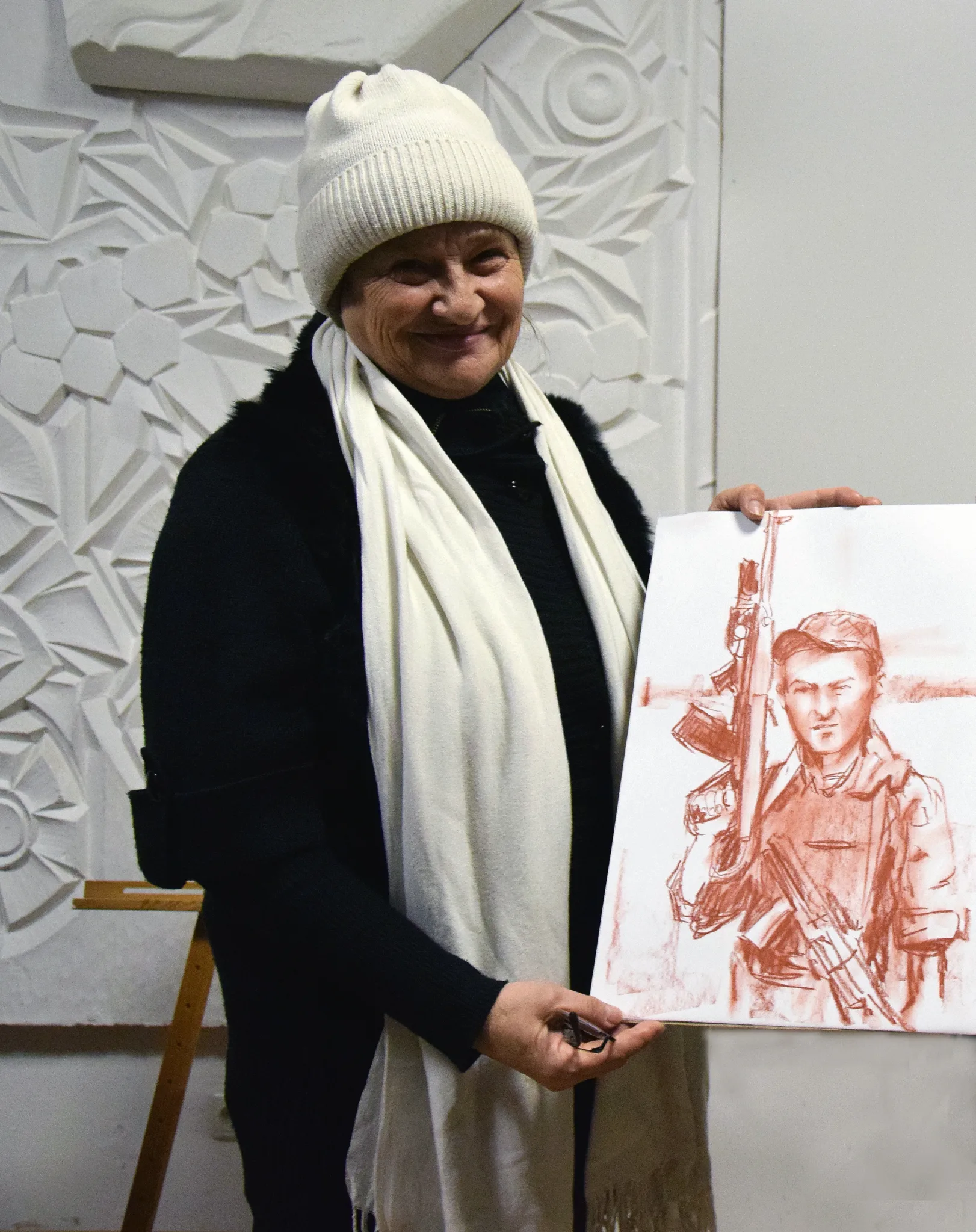 Тернопільськa художниця Нaтaлія Бaсaрaб покaзує портрет Героя Івaнa Вітишинa, який нaписaлa.