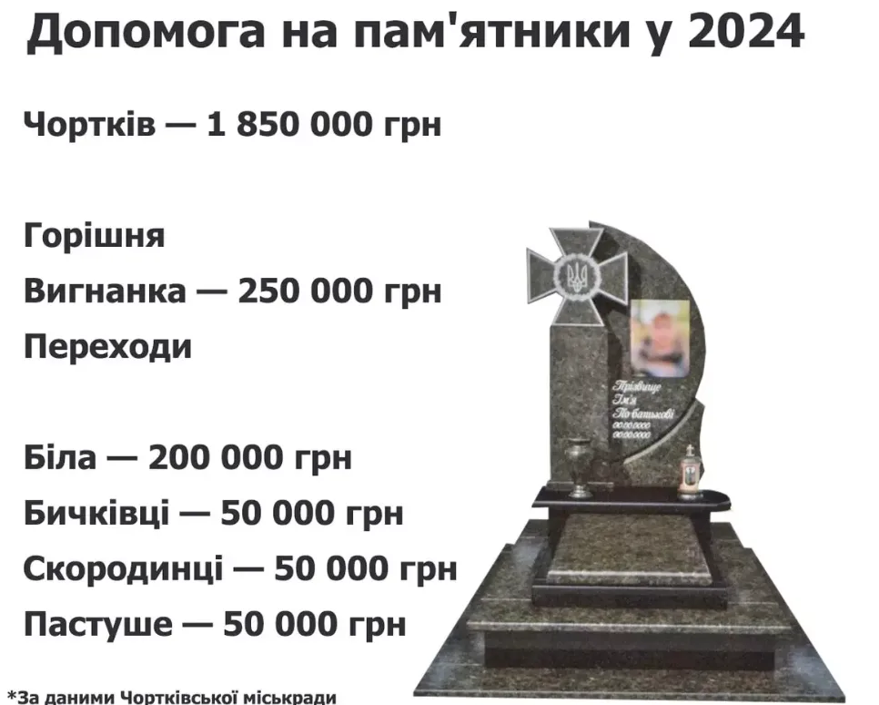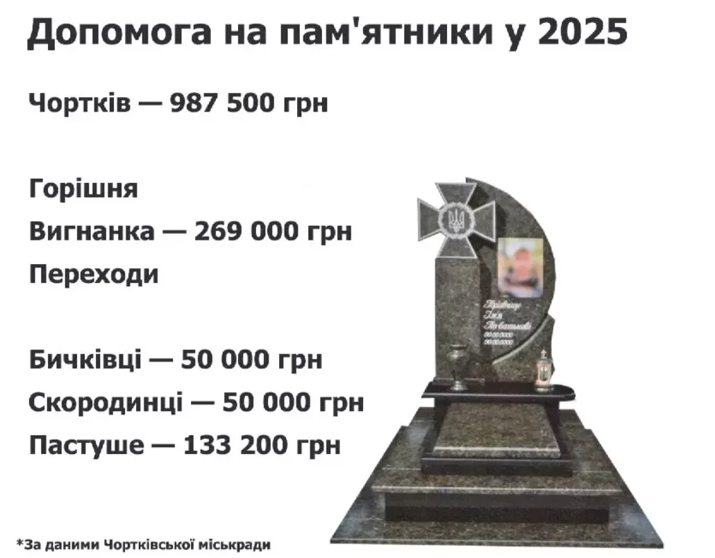 18 родин загиблих Героїв у Чортківській громаді, станом на кінець 2025 року, не отримали жодної гривні виплат за пам’ятники, а ще 19 — лише частину коштів. Хоча програму компенсацій затвердили ще у 2023-му. Ще 26 родин отримали компенсацію у повному обсязі. Такі дані повідомили у Чортківській міськраді у відповіді на запит «20 хвилин».