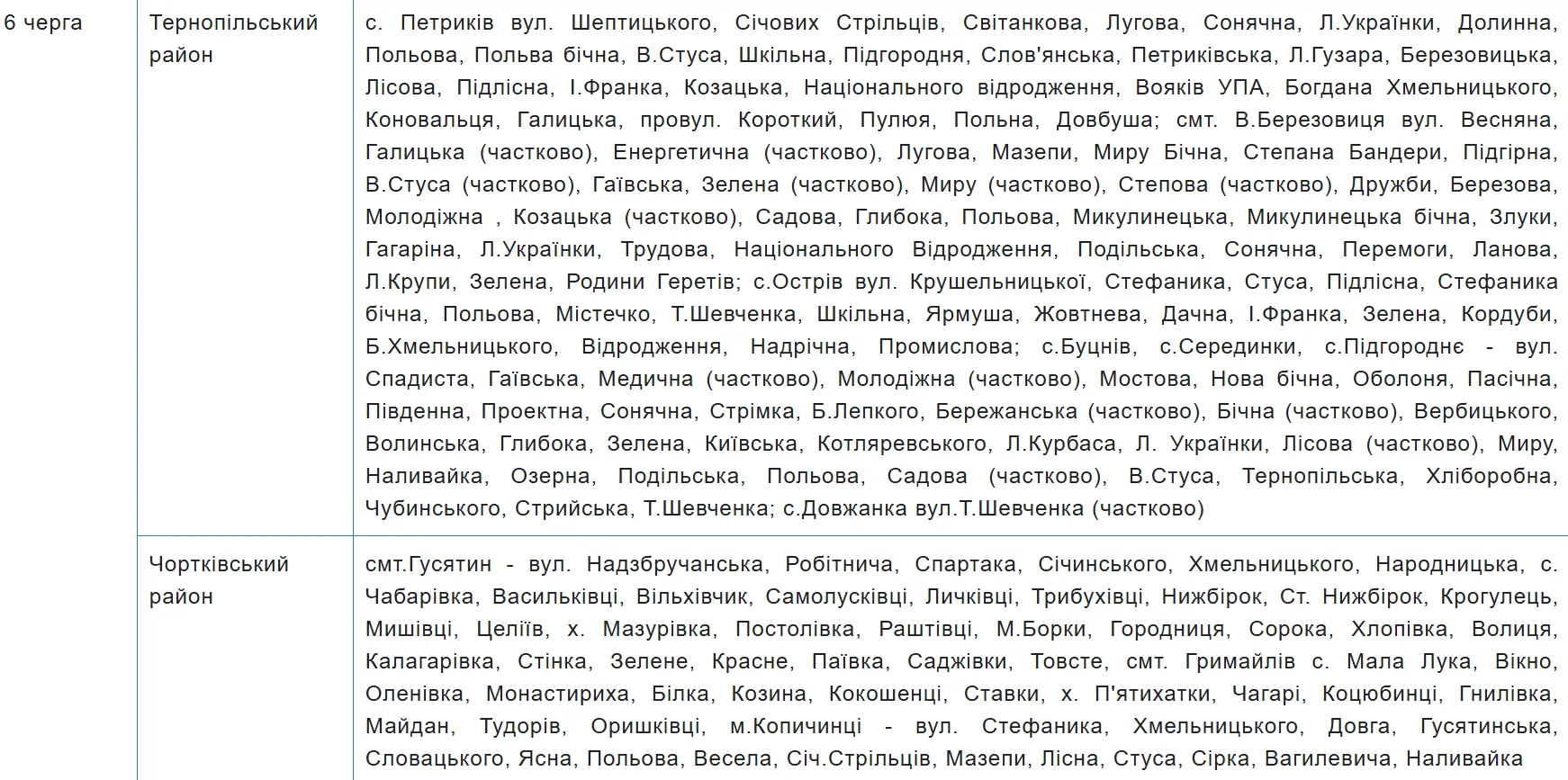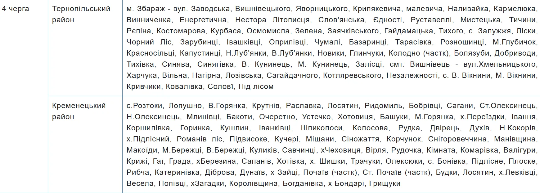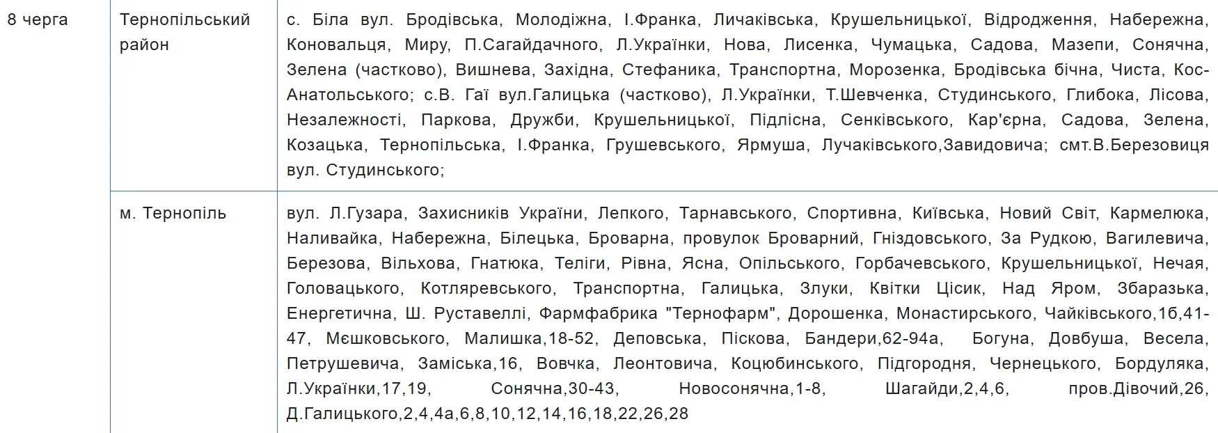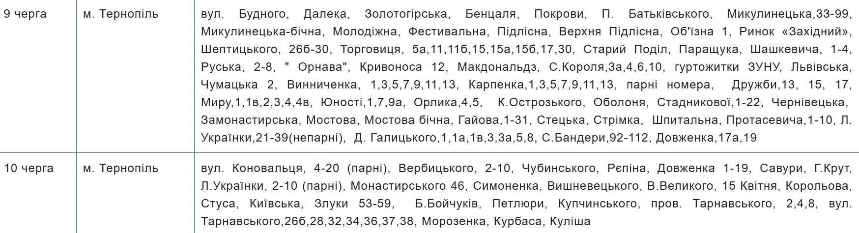 Графік аварійних відключень електроенергії на Тернопільщині містить 10 черг, за якими розподілили споживачів. Перелік населених пунктів та вулиць закріпили за кожною з них — шукайте своє місто, село чи вулицю у таблиці.