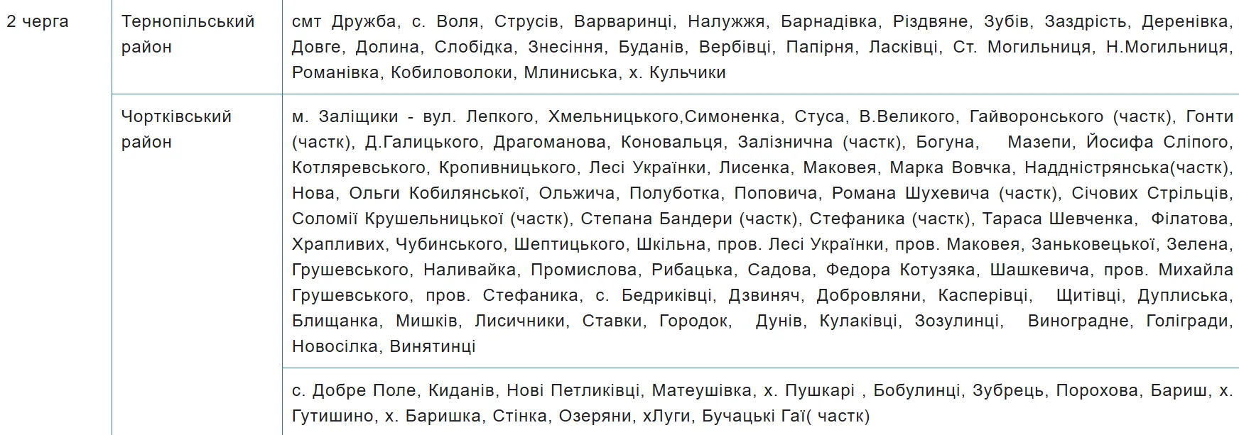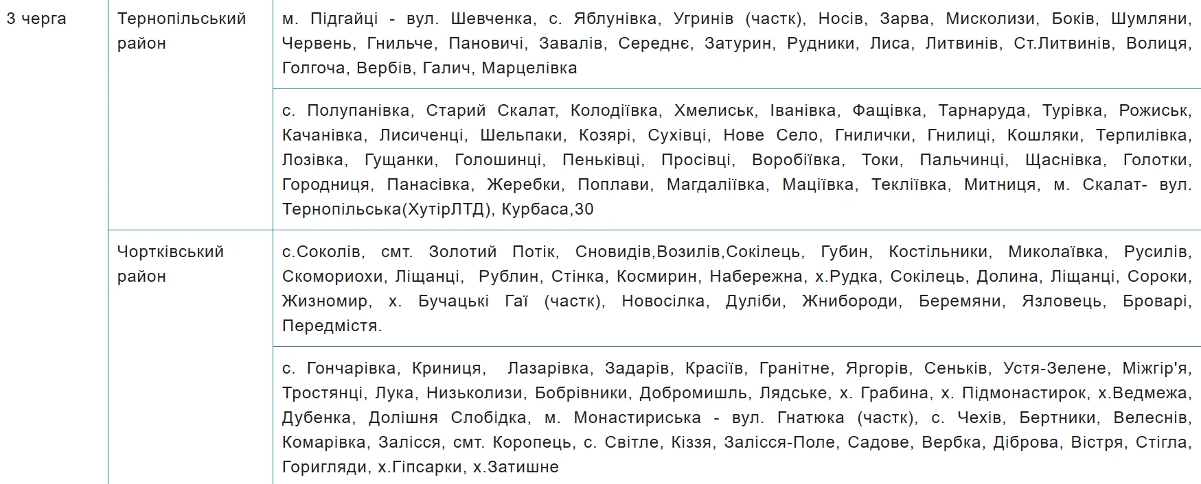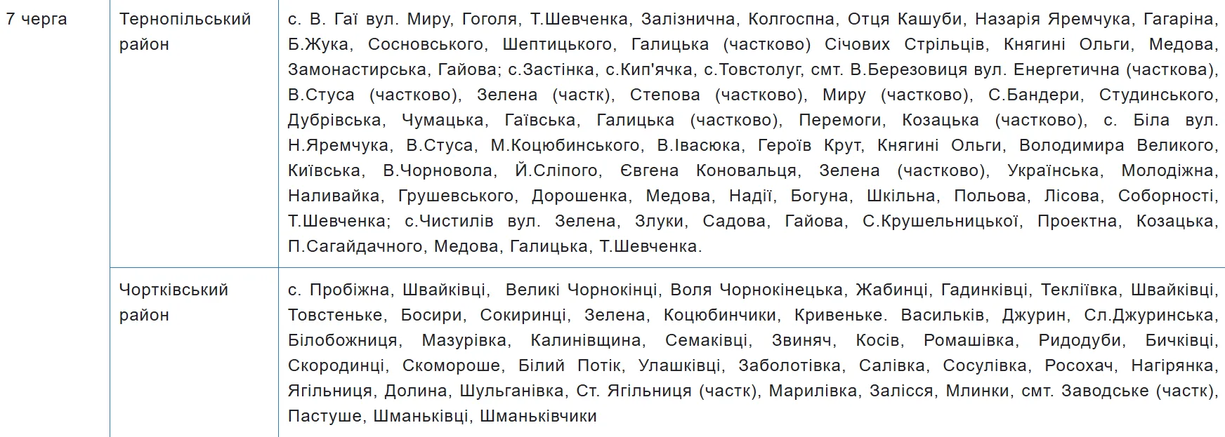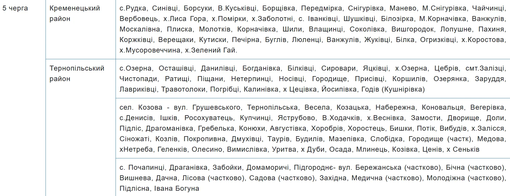 Графік аварійних відключень електроенергії на Тернопільщині містить 10 черг, за якими розподілили споживачів. Перелік населених пунктів та вулиць закріпили за кожною з них — шукайте своє місто, село чи вулицю у таблиці.