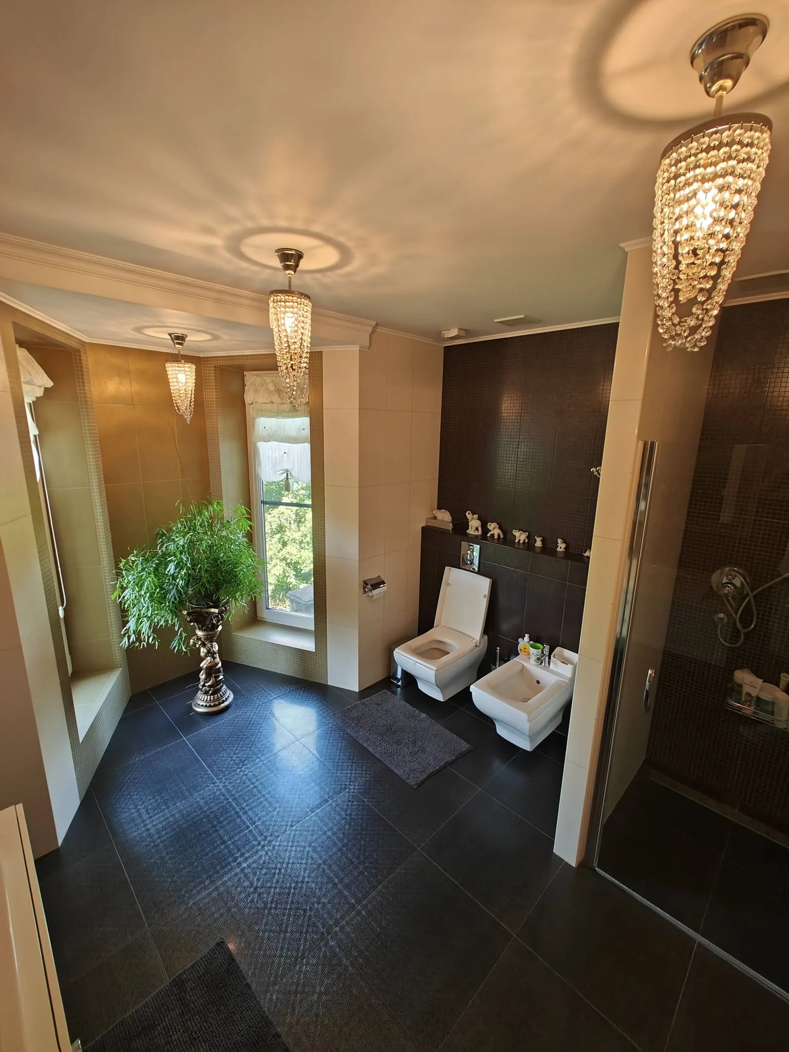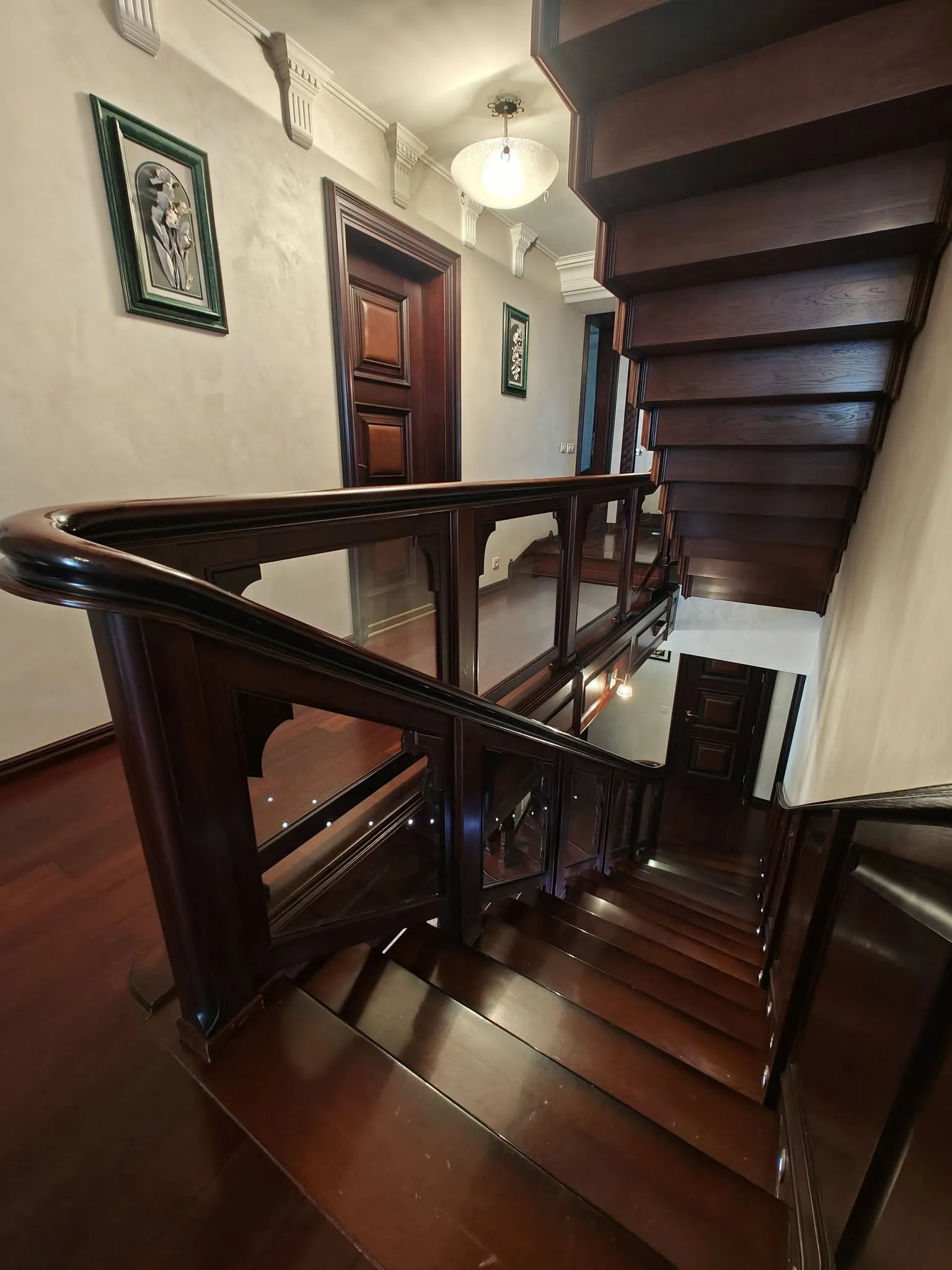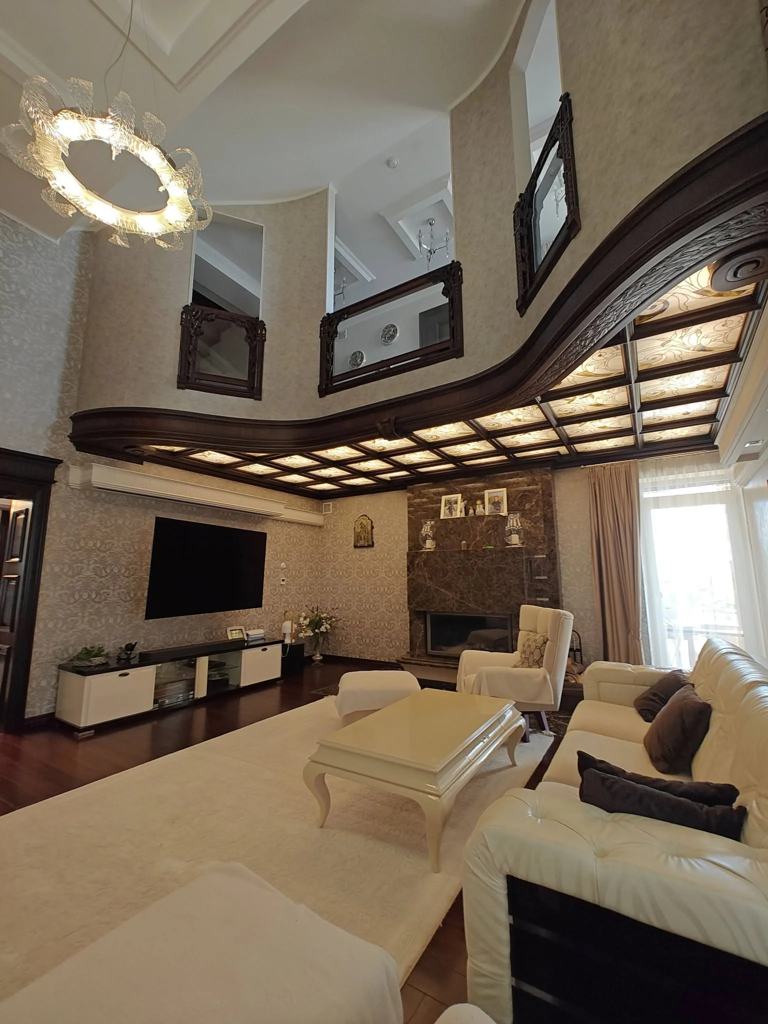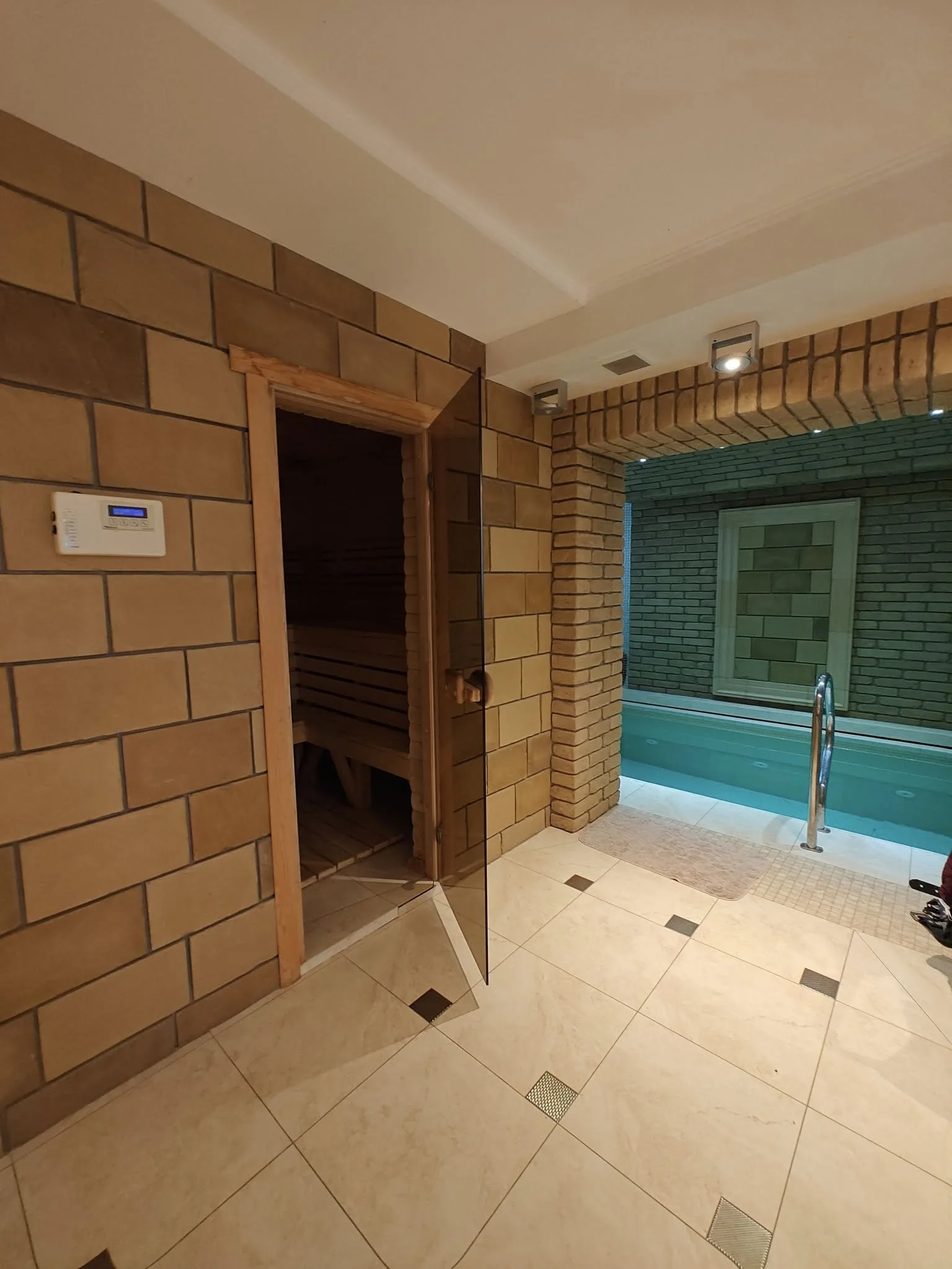 Оселя має власний басейн, сауну, альтанку з каміном, три гаражі та літню кухню площею 161 м². Для домашніх улюбленців облаштовані два вольєри. На території — доглянутий сад, город та система автоматичного поливу.