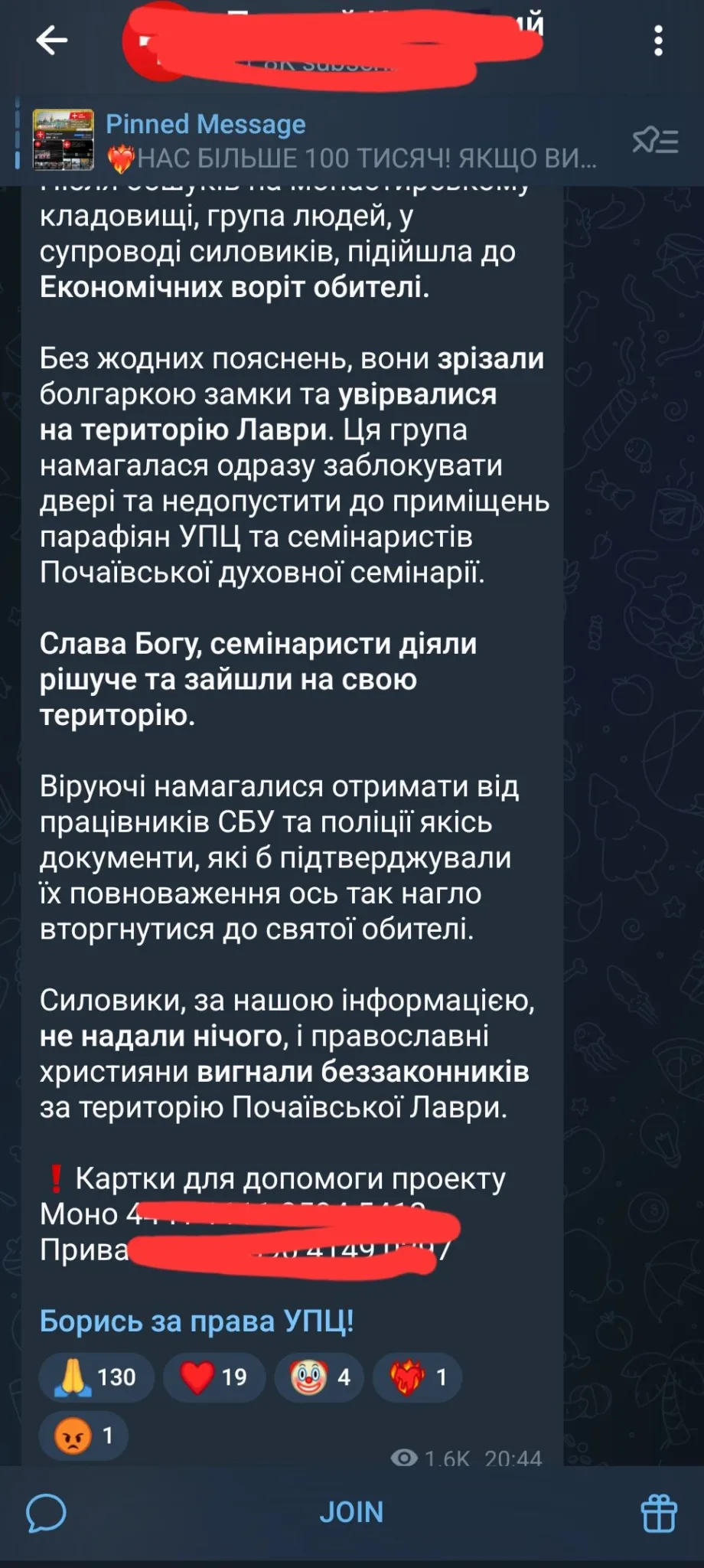 У той самий день Василь Ільчишин оприлюднив ще один показовий приклад діяльності структур, пов’язаних із московським патріархатом. У своєму дописі він звернув увагу на один із Telegram-каналів, який відкрито просить «молитися за істєную віру», але водночас закликає надсилати гроші на підтримку “проекту”.