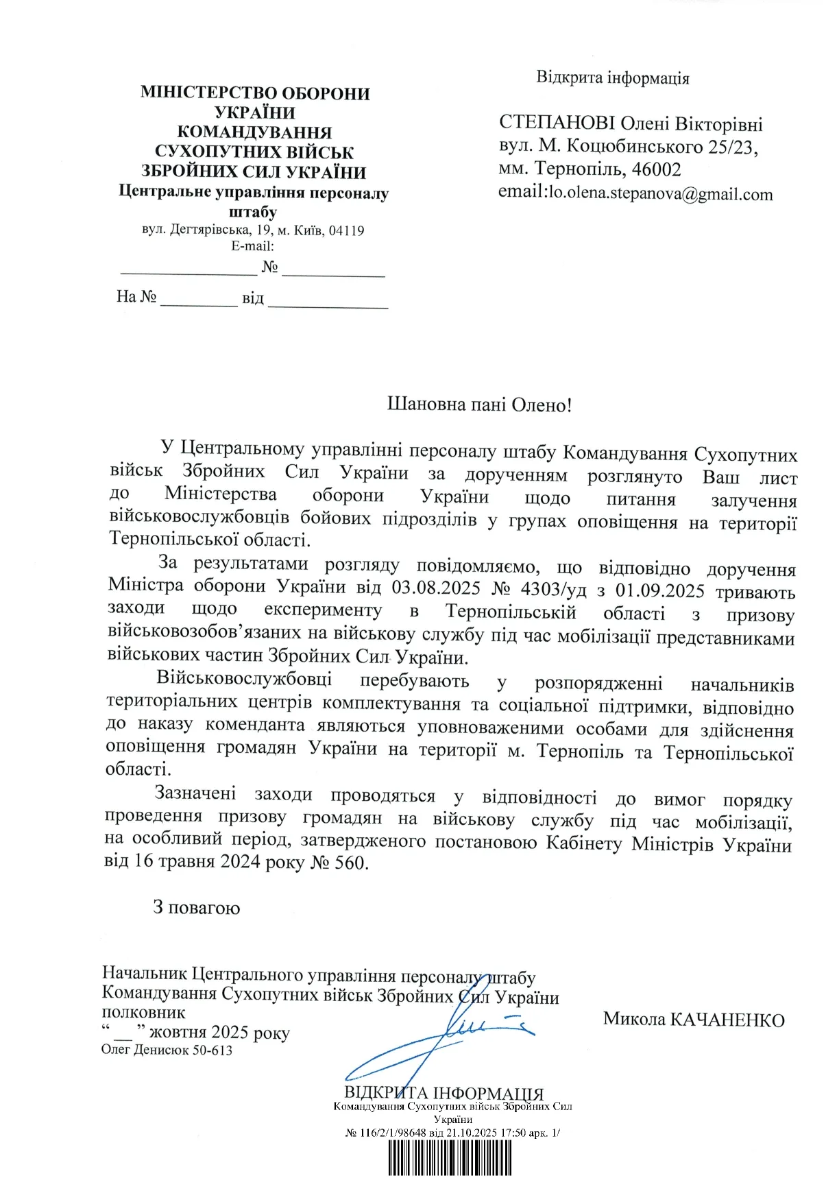 «Про експеримент знали всі: ТЦК, поліція, органи місцевого самоврядування. Просто мовчали. На основі офіційної відповіді Генштабу я бачу, що ці “заходи” не мають жодної законної основи», — зазначила адвокатка.