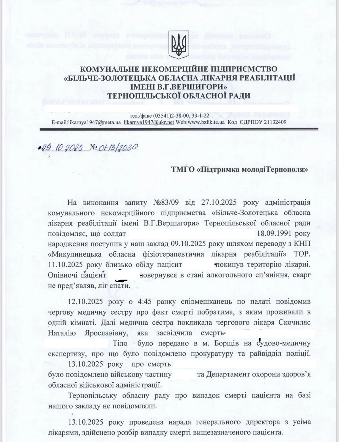 Наступного дня, 13 жовтня, лікарня формально виконала частину звітності: про смерть повідомили військову частину, де служив Олександр П., та Департамент охорони здоров’я Тернопільської ОВА.