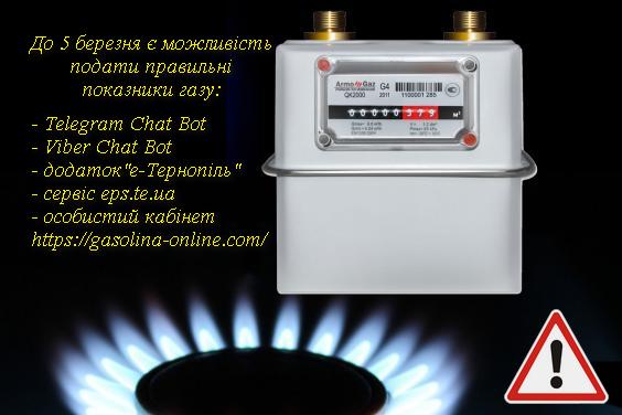 Подати показник через Telergram Chat Bot, Viber Chat Bot, через додаток «е-Тернопіль», через сервіс eps.te.ua, особистий кабінет https://gasolina-online.com/.