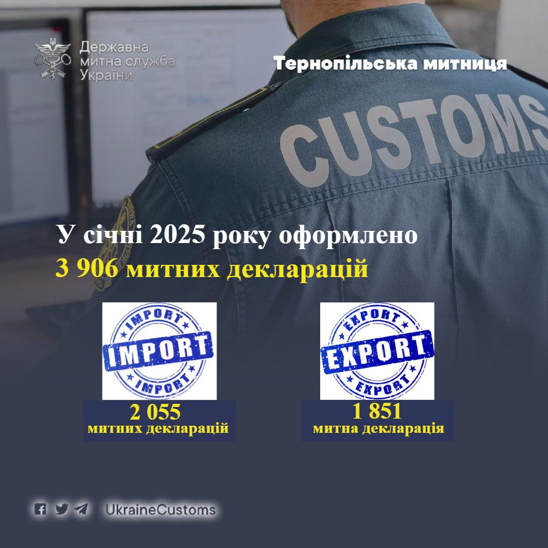У січні цього року Тернопільська митниця активно працювала над оформленням митних декларацій, здійснивши відповідно 3 906 таких оформлень. Переважну більшість із них склали імпортні декларації – 2 055 одиниць, тоді як експортних було дещо менше – 1 851.