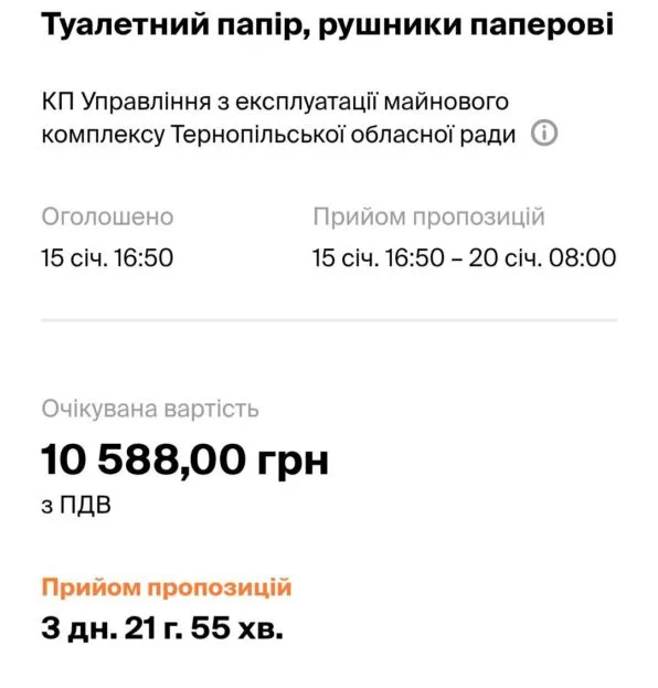 Управління з експлуатації майнового комплексу Тернопільської обласної ради в особі його керівника Ярослава Олександровича Дрюченко (депутат облради з фракції “За майбутнє”) оголосила тендер на закупівлю туалетного паперу на 10 588 грн.