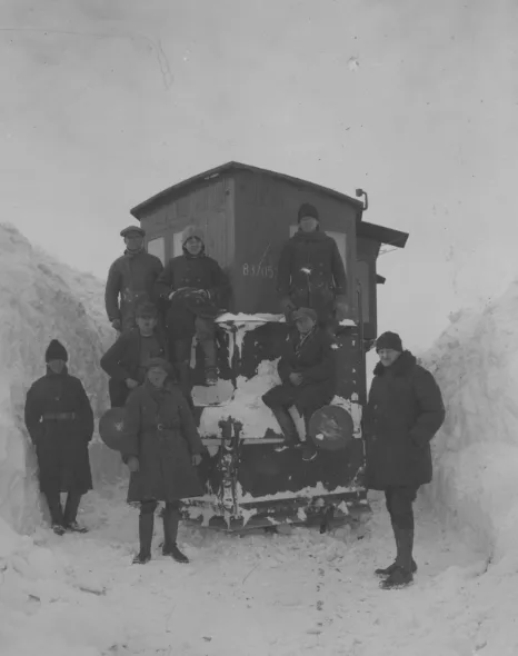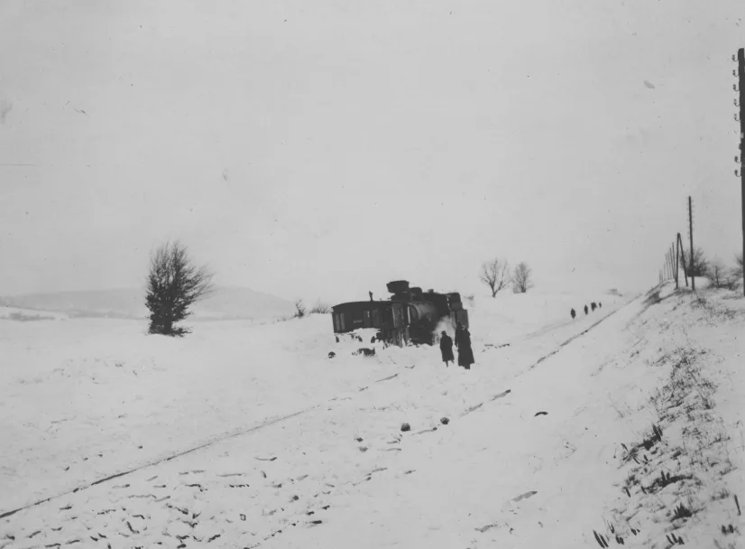 На знімку зафіксована справжня зимова негода, яка накрила захід України наприкінці 1920-х років. Ми бачимо засипану снігом ділянку залізниці Львів — Тернопіль, яка тоді була однією з ключових транспортних артерій регіону.