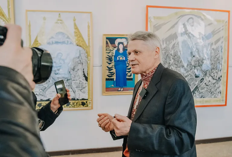 – Картина в процесі виконання в мене вимагає декілька місяців. От графіка, багатофігурна композиція, і треба намалювати одяг, обстановку, відтворити той час історичний, які події відбуваються, все це має бути вималювано графічно, там, мільйони штрихів! Це вимагає від мене багато праці. Тим більше в мене робота не на мольберті стоїть, а я лежу на ній. Якщо величезний розмір, то я так мушу, а якщо менший розмір, – то на столі малюю. Навколо неї можу ходити і малювати, і догори ногами малюю фігури. Став там і її малюю так, як мені зручно. Справа, зліва, рука, пензель, я малюю правою рукою, лівою не можу. Тому оцей баланс, щоб не крутити багато, мушу малювати навіть верх ногами картину.