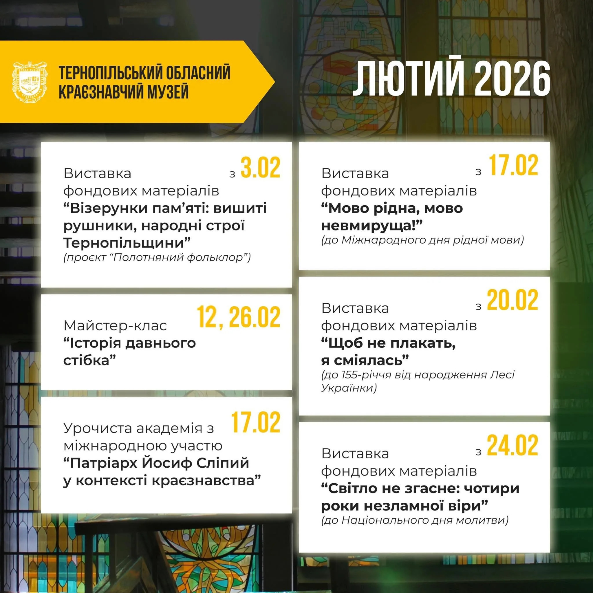 У лютому Тернопільський обласний краєзнавчий музей запрошує відвідувачів на низку пізнавальних заходів.