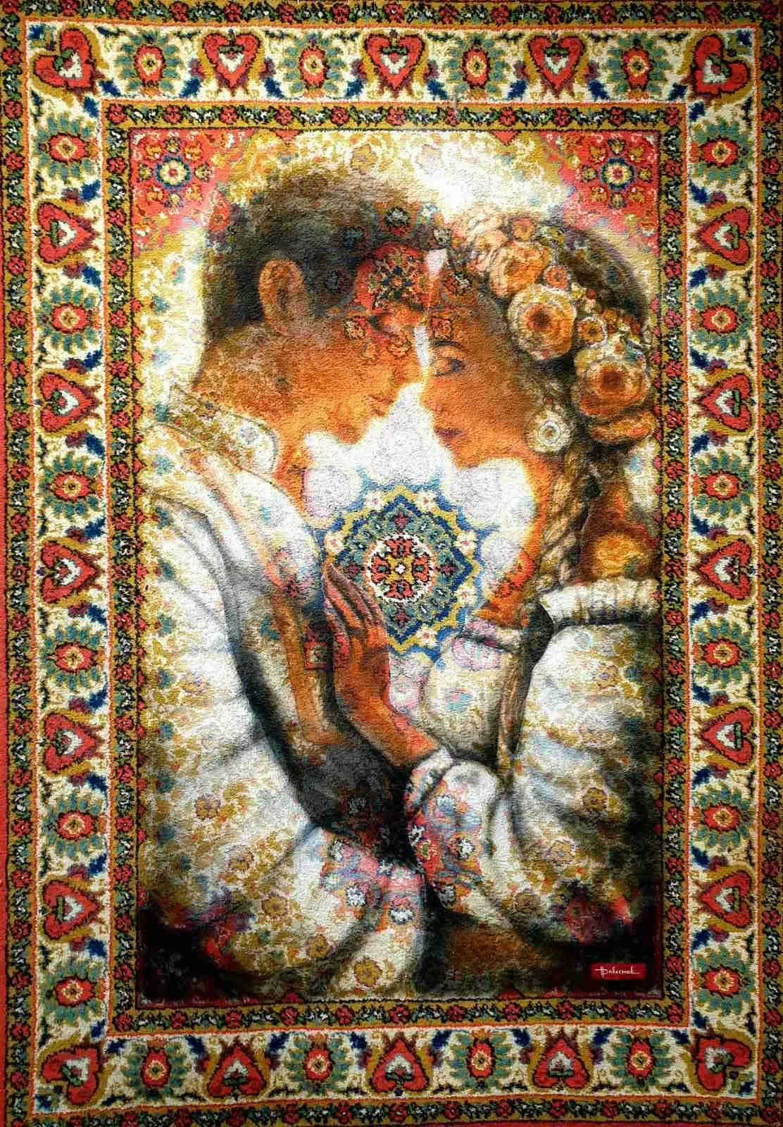 Також візерунки килимів створюють наче своєрідний макіяж на обличчях. Майже всі мої килими-картини — портретні, лише на одному зображена пара людей у профіль. Природу чи щось інше поки що малювати на килимах не пробував. Сюжети в основному національні.