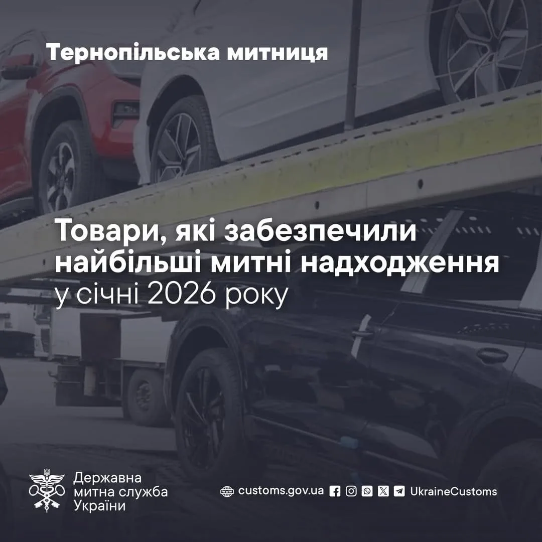 Товари, які забезпечили найбільші митні надходження у січні 2026 року на Тернопільщині