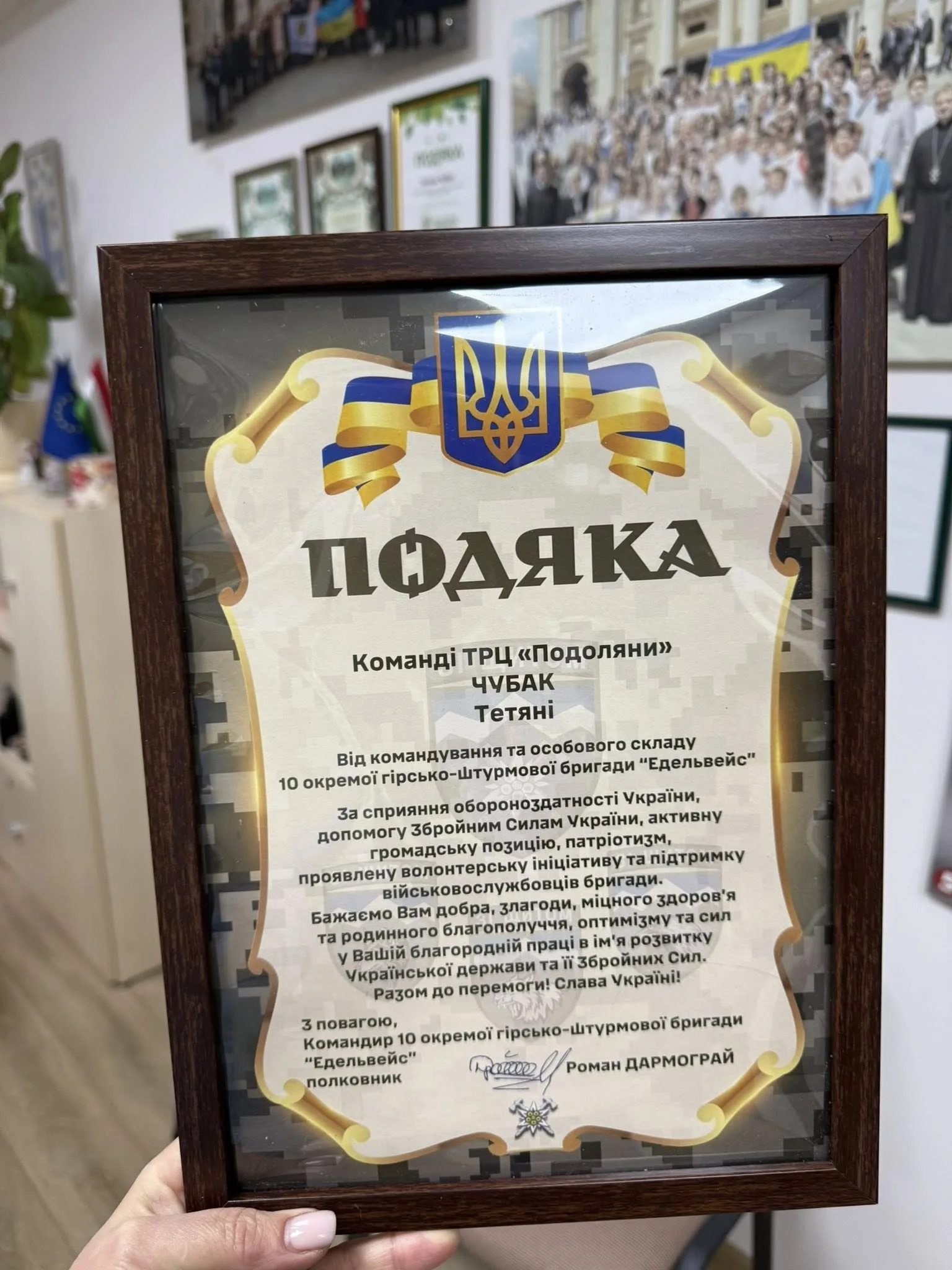 Колектив Тернопільського торгово-розважального центру «Подоляни» отримав подяку від 10-ї гірсько-штурмової бригади за сприяння обороноздатності України, підтримку ЗСУ та активну громадську позицію.