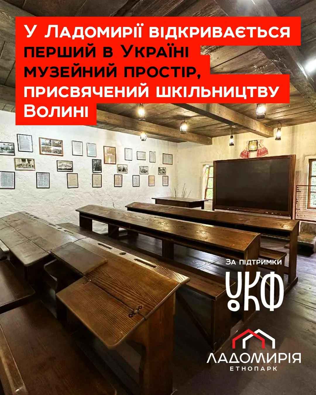 Цієї осені етнопарк «Ладомирія» відкриває оновлену музейно-освітню експозицію, присвячену історії шкільництва Волині. Минулоріч тут вже працювала виставка, що презентувала шкільний клас кінця XIX століття, але тепер проєкт став значно масштабнішим і цікавішим.