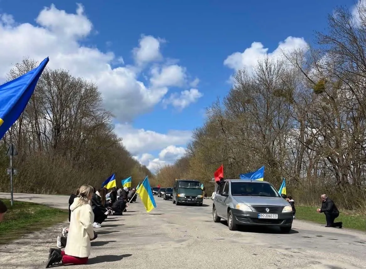 Жителі громади зустріли траурний кортеж «живим коридором» — на колінах та зі сльозами на очах, віддаючи останню шану захиснику.