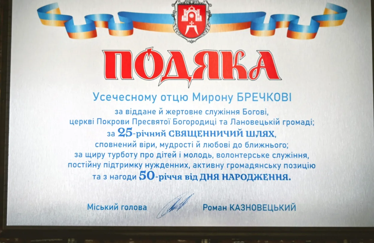 1 лютого у храмі Покрови Пресвятої Богородиці УГКЦ у Ланівцях відбулася урочиста подія — парафіяни та громада привітали отця Мирона Бречка з 25-річчям священничого служіння та 50-річним ювілеєм.