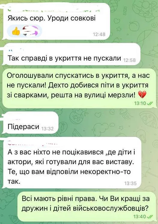 «Ми прийшли на виставу в “Березіль” на 12:00. Після початку тривоги адміністрація заборонила заходити в укриття батькам з дітьми. Сказали – “Лише для працівників Березілю”».