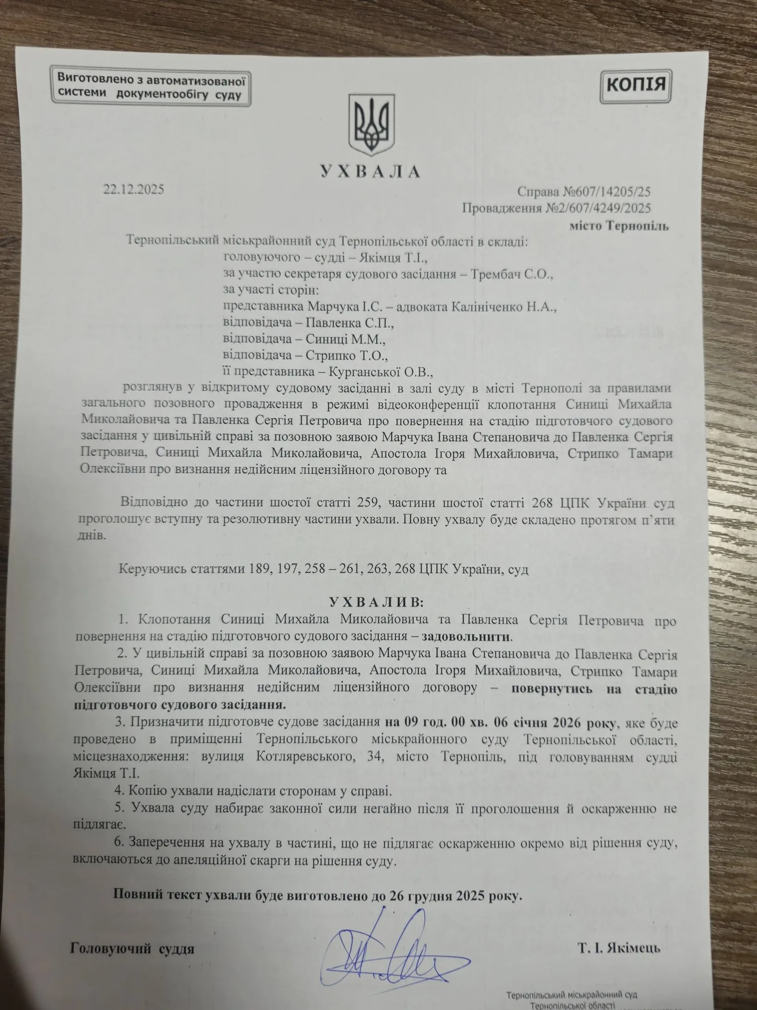 22 грудня в Тернопільському міськрайонному суді, під головуванням судді Якімця Тараса Ігоровича, відбулось слухання по резонансній справі за позовом всесвітньо відомого художника Івана Марчука, до групи осіб, про визнання Ліцезійної Угоди підписаної від його імені, як такої що здійснена в шахрайський спосіб.