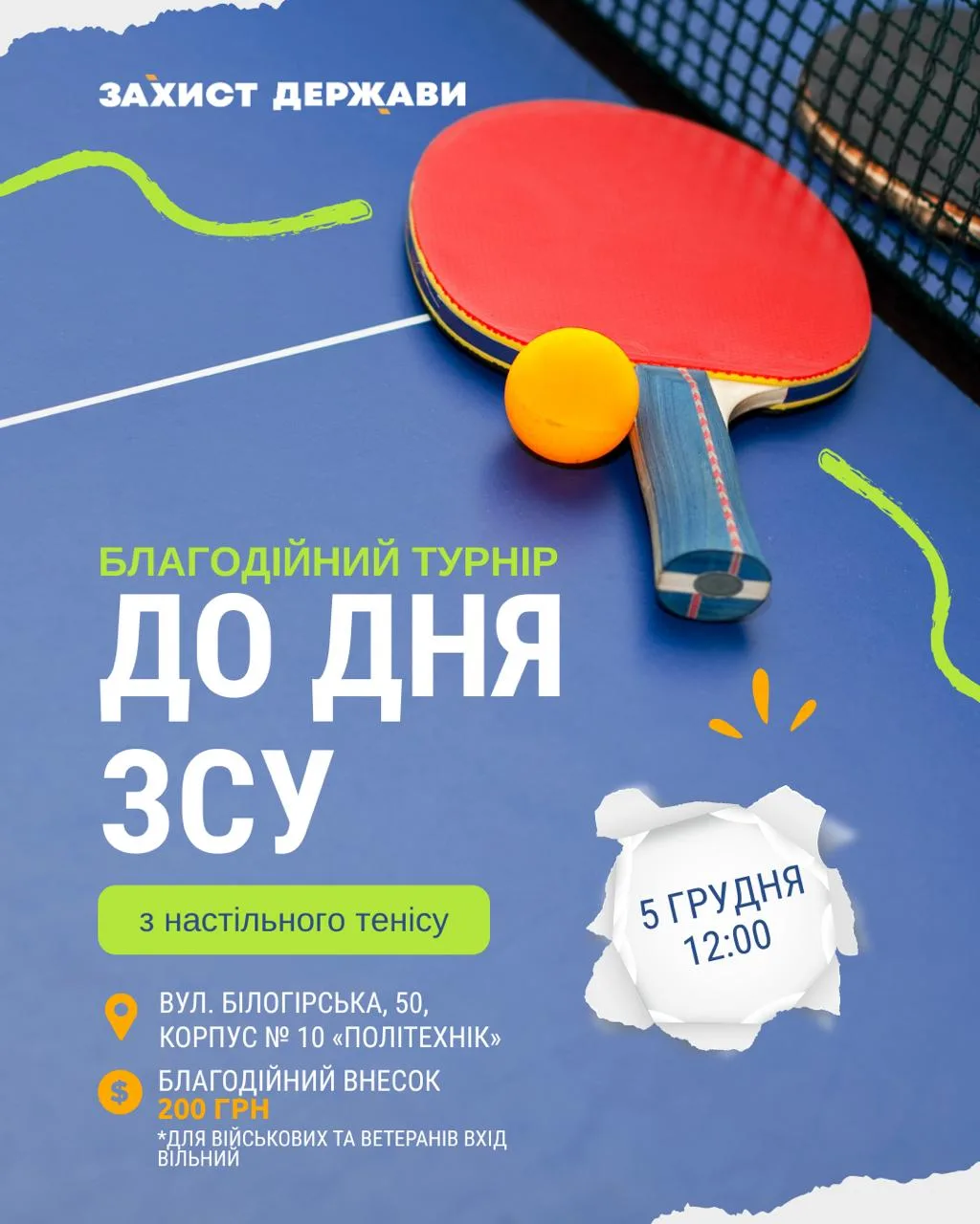 До Дня Збройних Сил України Тернопільський обласний осередок ГО «Захист Держави» організовує благодійний турнір з настільного тенісу. Усі охочі можуть долучитися до події, щоб підтримати українських військових, провести час із користю та взяти участь у дружніх спортивних змаганнях.