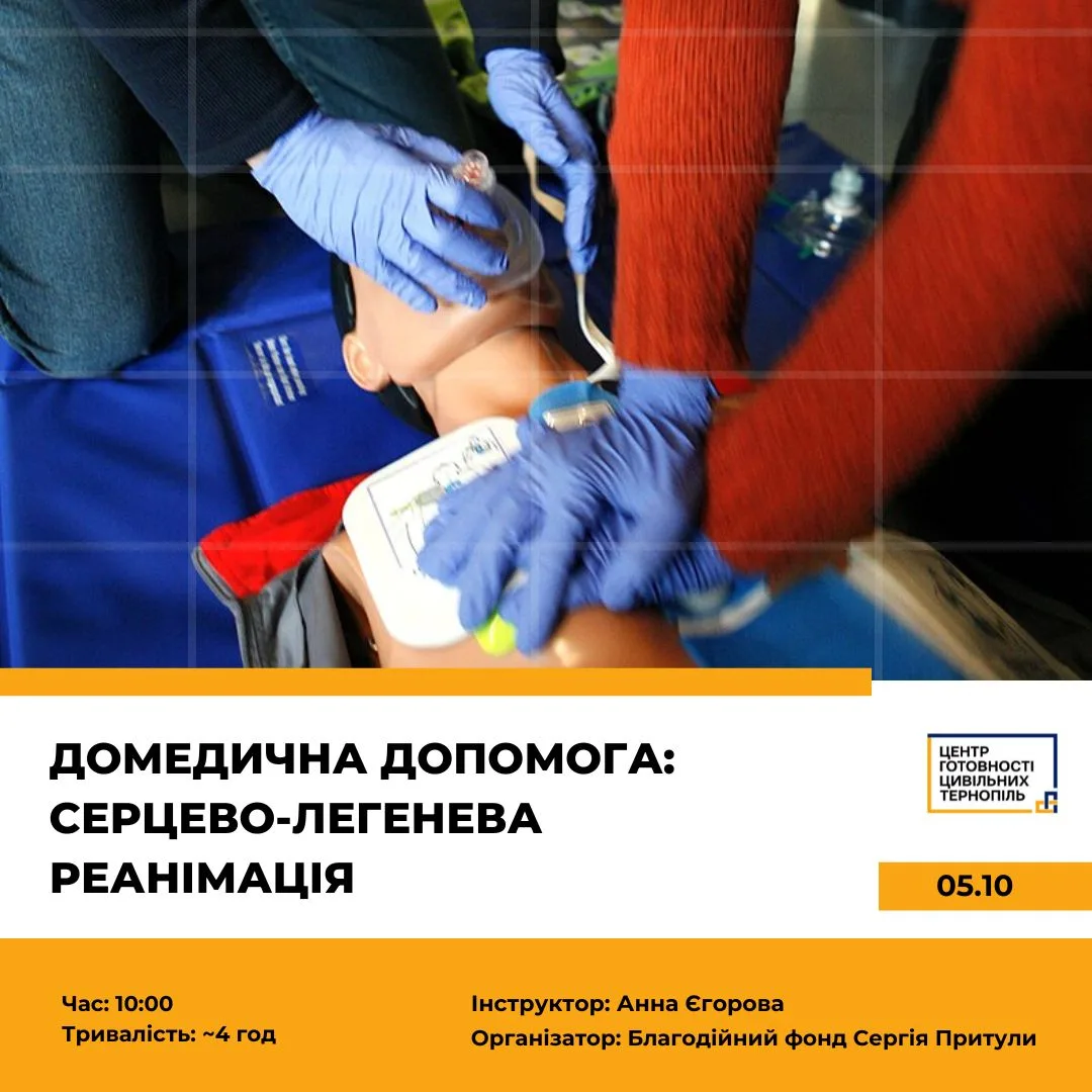 Центр готовності цивільних повідомляє про старт навчання на тему «Домедична допомога: серцево-легенева реанімація», яке відбудеться 5 жовтня о 10:00 у Тернополі.