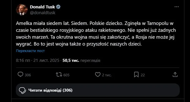 “Амелька мала сім років. Сім. Польська дитина. Загинула в Тернополі внаслідок жорстокого російського ракетного удару. Вона не зможе здійснити жодної своєї мрії. Ця жорстока війна має закінчитися, і Росія не може її виграти. Це також війна за майбутнє наших дітей”.