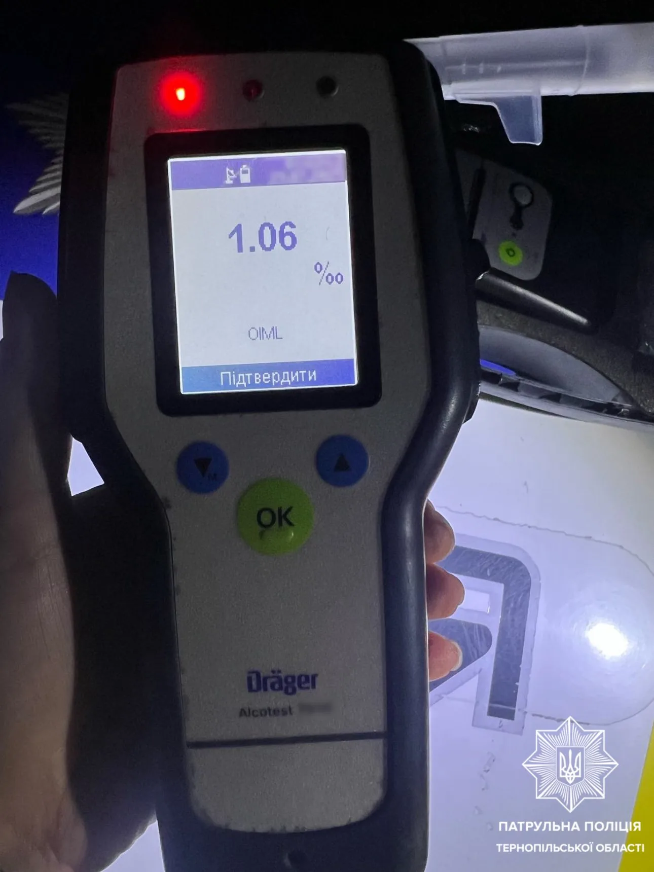 20-річний кермувальник погодився пройти огляд на місці за допомогою приладу Drager. Результат — 1,06 проміле, що більш ніж у п’ять разів перевищує допустиму норму.