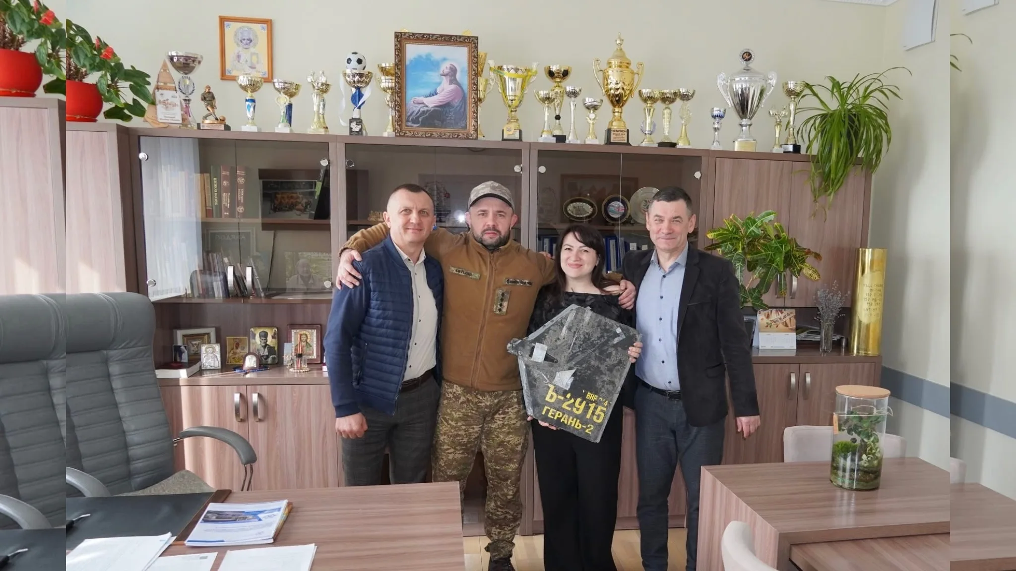 До громади бойовий офіцер завітав із незвичайним подарунком – уламком збитого російського безпілотника «Герань».