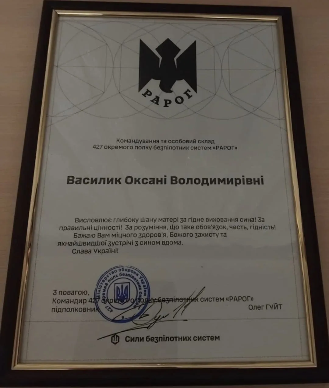 Окремі слова подяки адресували Оксані Василик за виховання сина, якого у громаді називають справжнім героєм і патріотом. У дописі підкреслили його мужність, самопожертву та відданість служінню українському народові.