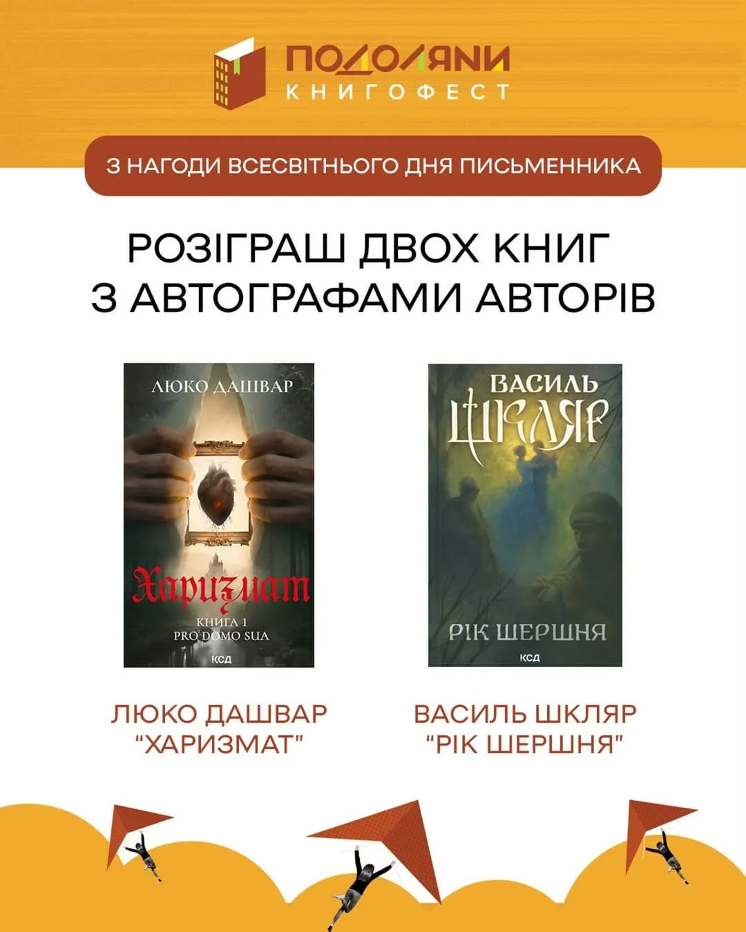 Тернополяни, тримайте літературну бомбу до Всесвітнього дня письменника! Команда «Книгофесту Подоляни» вирішила розіграти справжні скарби — книги, які підписали самі автори під час минулорічного фестивалю. Організатори популярного фестивалю «Книгофест Подоляни» оголосили розіграш двох знакових книг із особистими підписами авторів.